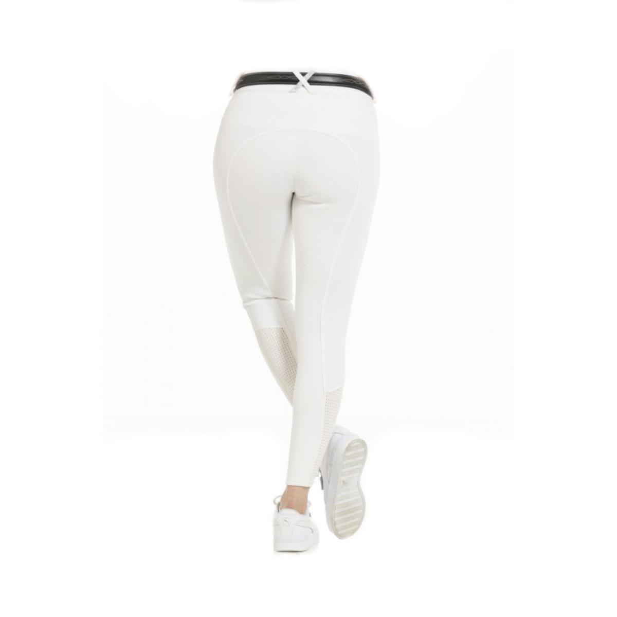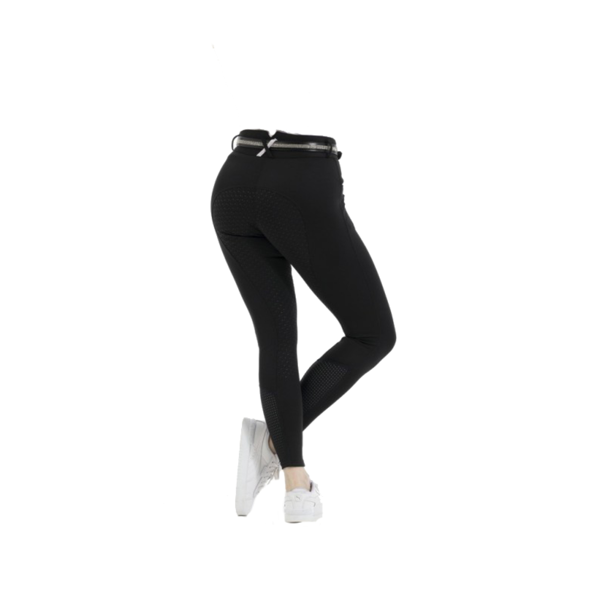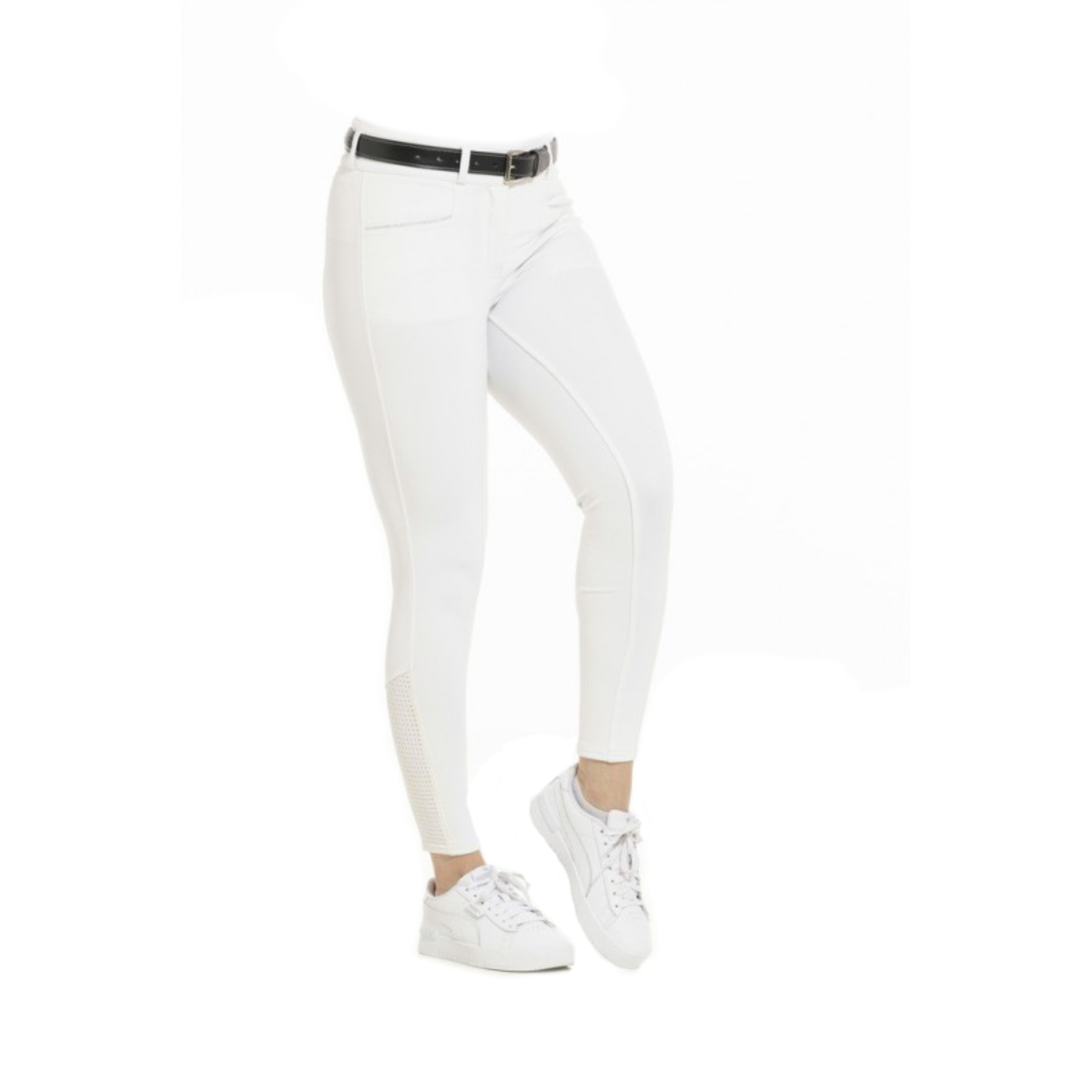 Женские бриджи с полной силиконовой леей (Riding Breeches with Silicone Patch). Силиконовая лея обеспечивает наибольшую фиксацию в седле. На поясе петли для ремня. Застёгиваются на молнию и брючный крючок. Два передних набедренных кармана, украшенных прострочкой контрастного цвета. В области щиколотки имеются перфорированные эластичные вставки для удобства одевания.