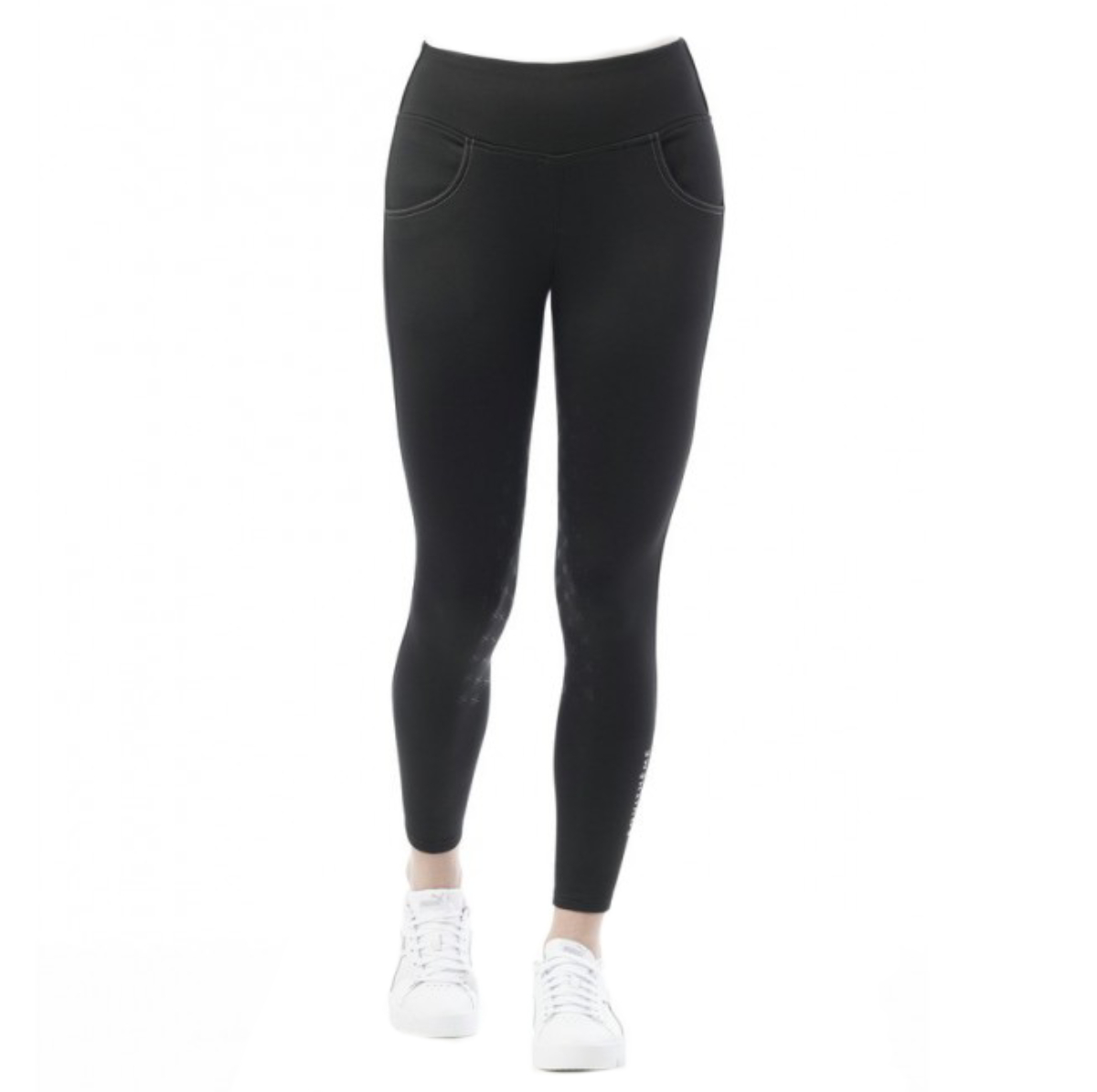Леггинсы с высокой талией на флисовом подкладе и силиконовой полной леей (Breeches with Silicone Patch). Силиконовая лея предполагает отстутствие лишних швов в зоне колен и обеспечивает наибольшую фиксацию в седле. Материал плотный, комфортный для тела, "дышащий", эластичный. Хорошо защищает от ветра и влаги. Красивый силиконовый орнамент в области талии. Два кармана спереди.