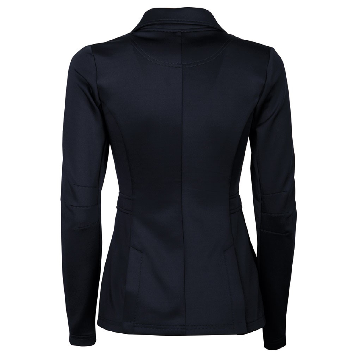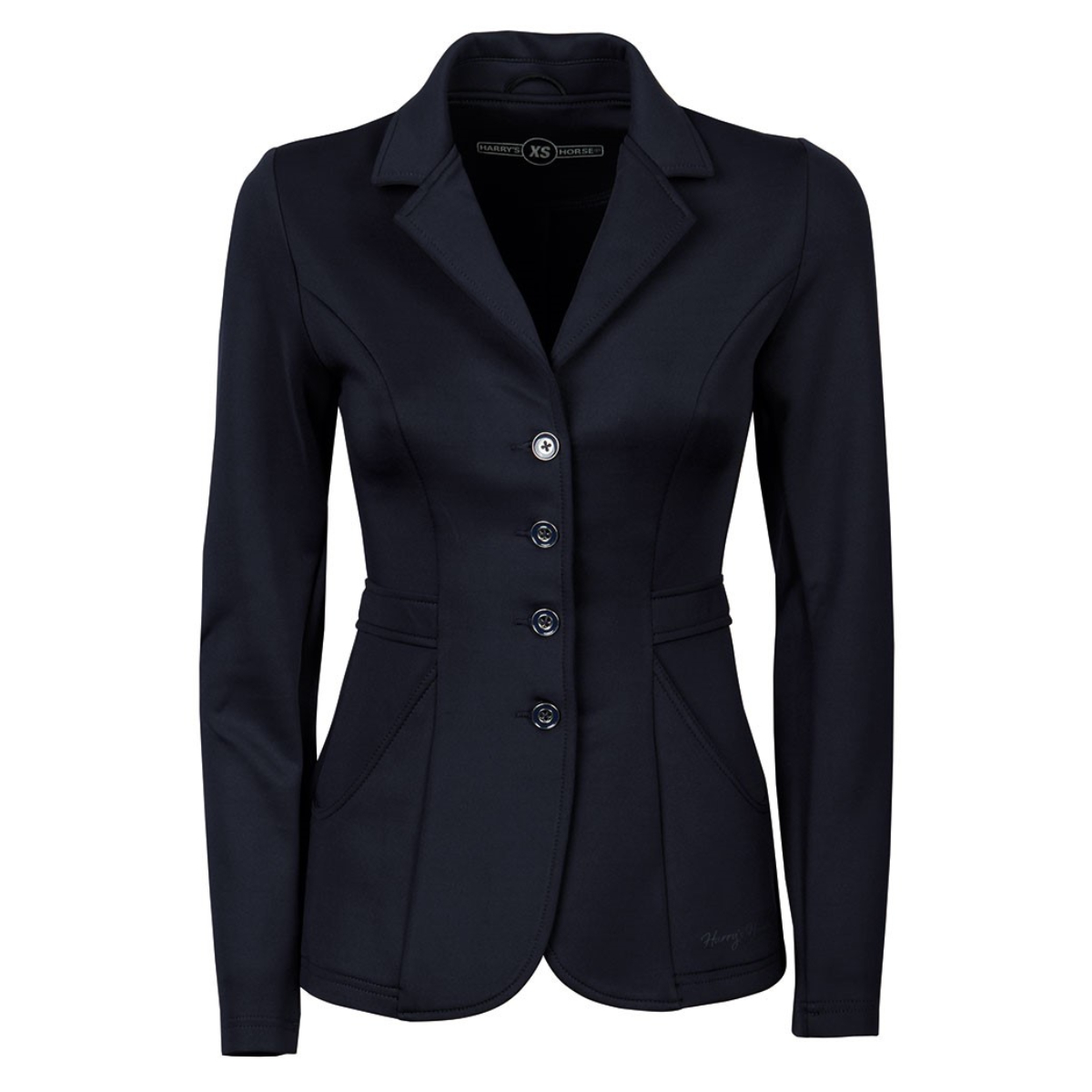 Элегантный дамский редингот для выступлений (Competition Jacket for Women) приталенного кроя. Редингот на четырех пуговицах. Два кармана и две шлицы сзади. Серебристые пуговицы.
