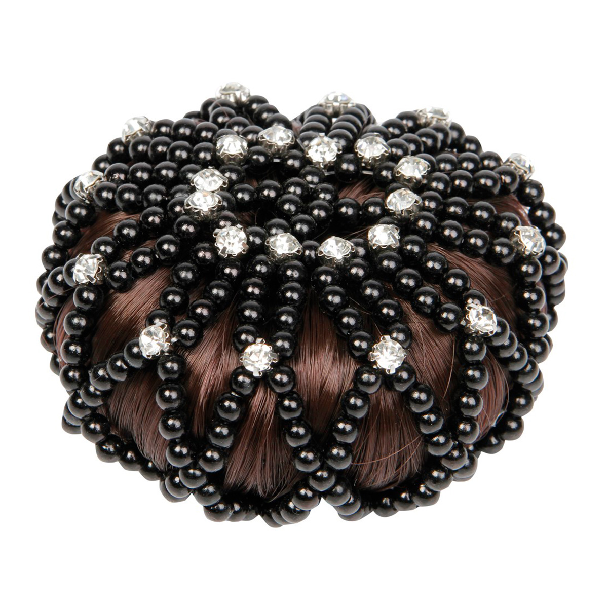Роскошная эластичная сеточка для волос (Hair net bun cover) Выполнена из бусин черного цвета, украшена кристаллами. Элегантный аксессуар, с помощью которого можно красиво заплести волосы во время выездковых турниров, где это требуется правилами.