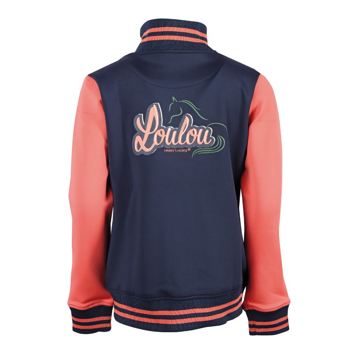 Спортивная детская толстовка (Jacket) с двусторонней застежкой-молнией. По бокам два кармана на молнии. На манжетах и поясе отделка контрастными полосками. Большой принт "LouLou" на спине и маленький-на груди.