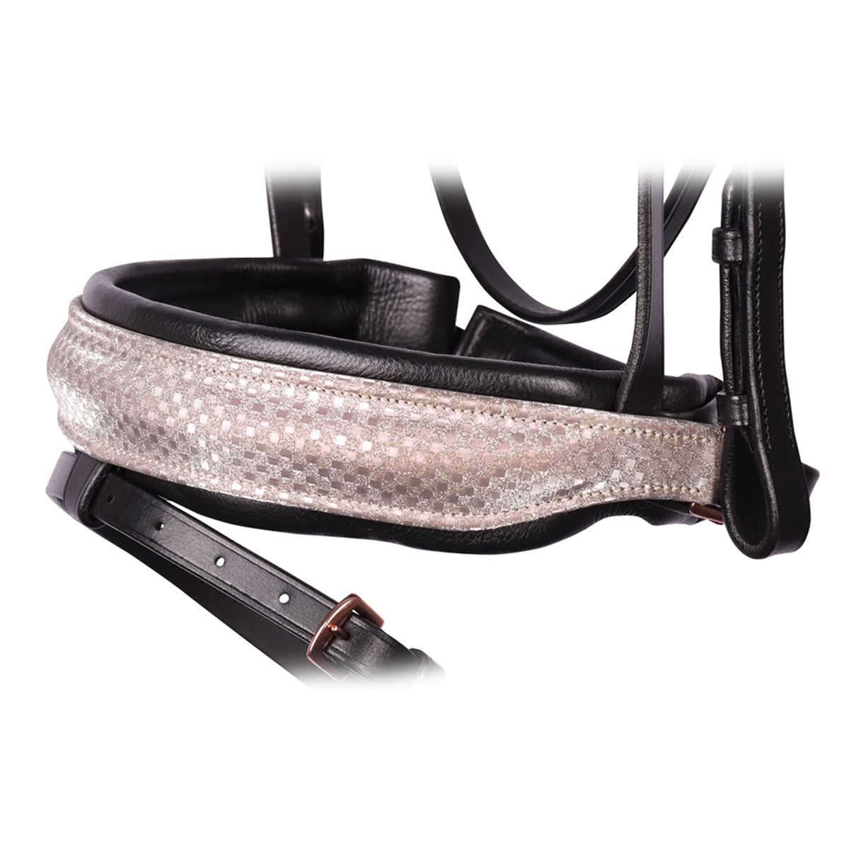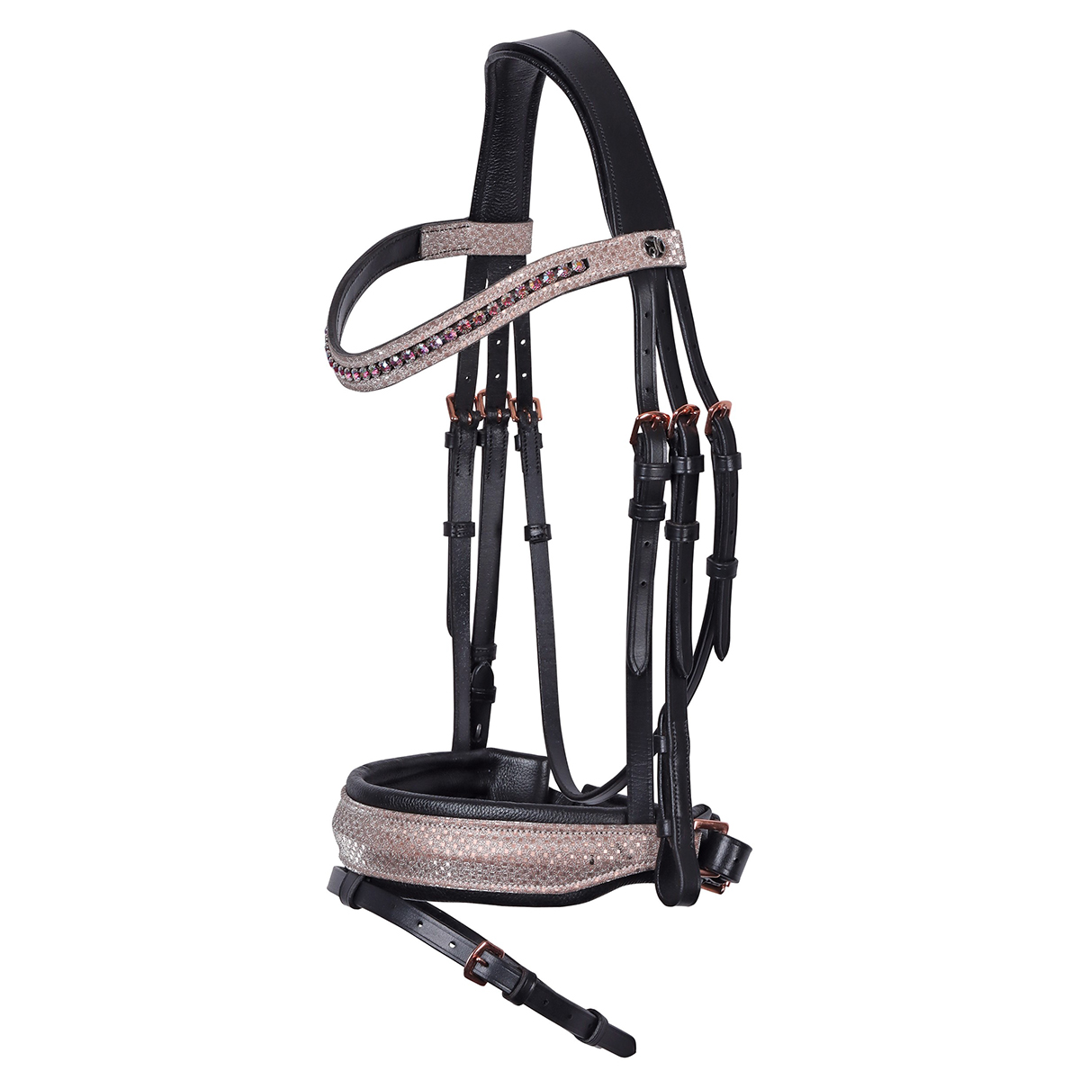 Оголовье из натуральной кожи (Leather Bridle) с пряжками из металла цвета розового золота. Налобный ремень украшен стразами. Мягкие подложки на широком (5см) капсюле, налобном и затылочном ремнях делает уздечку комфортной даже для чувствительных лошадей. В комплекте с уздечкой идет повод. Затылочный ремень анатомической формы. В комплекте сменный налобный ремень черного цвета со стразами. Трензель в комплект не входит.