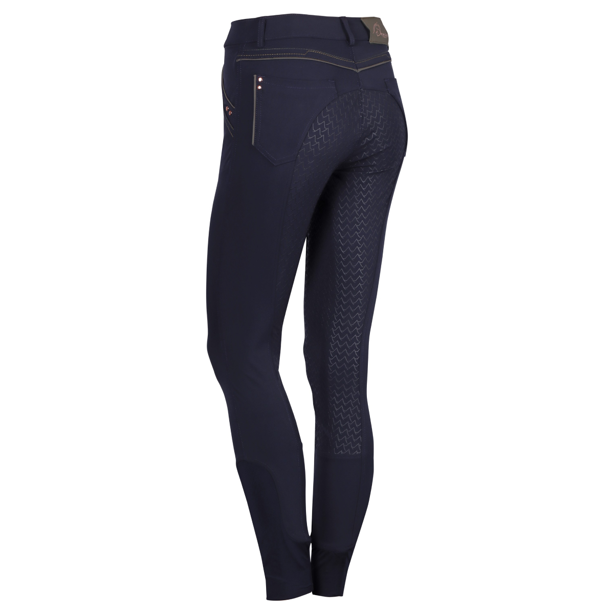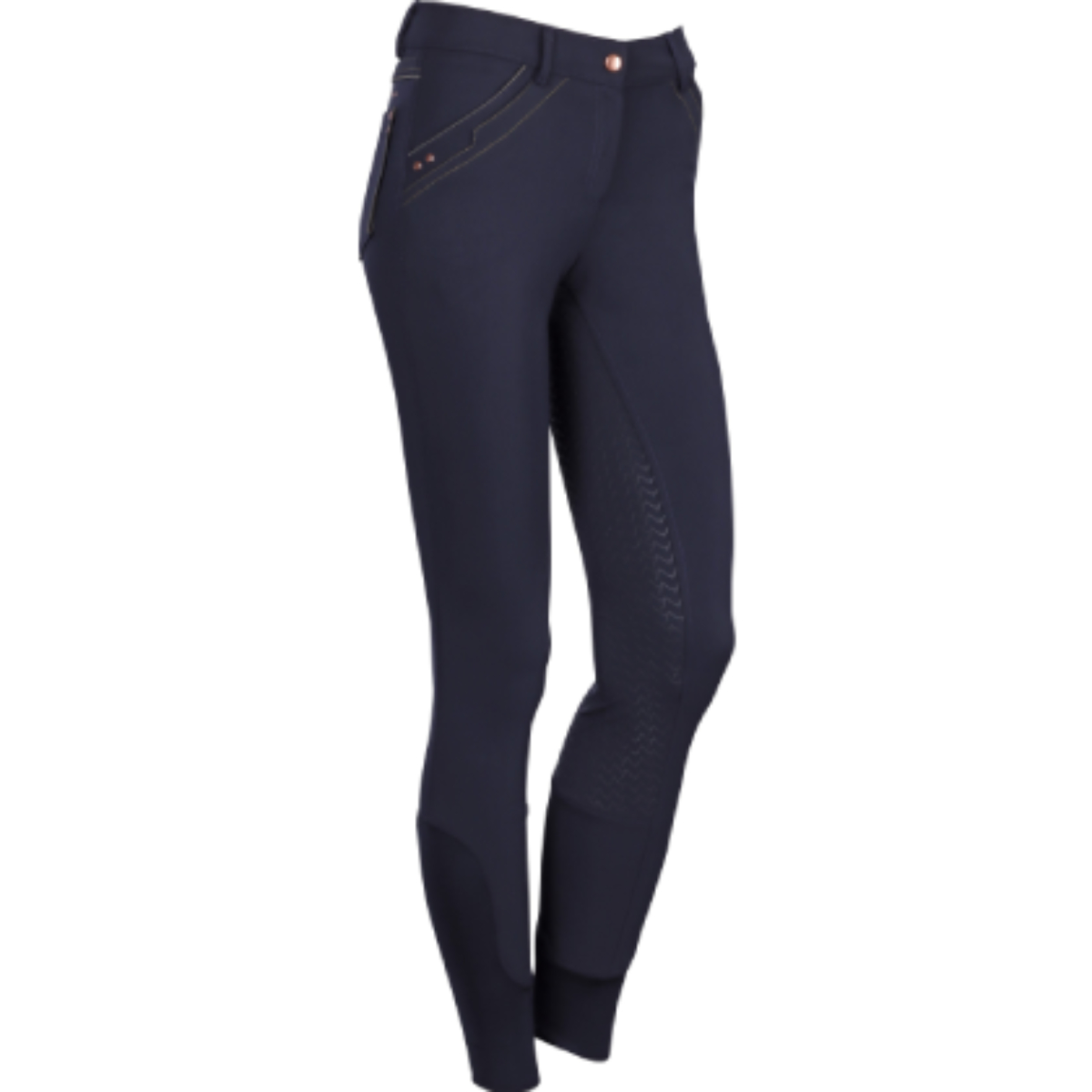 Бриджи с полной силиконовой леей (Breeches with Silicone Patch). Силиконовая лея предполагает отстутствие лишних швов в зоне колен и обеспечивает наибольшую фиксацию в седле. Изготовлены из чрезвычайно удобной и эластичной ткани. Боковые и задние карманы украшены контрастной отсрочкой и заклепками цвета розвого золота. В области щиколотки имеется эластичная сетчатая вставка для удобства надевания.