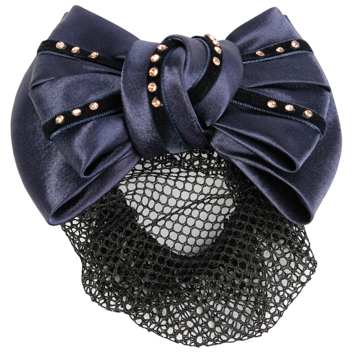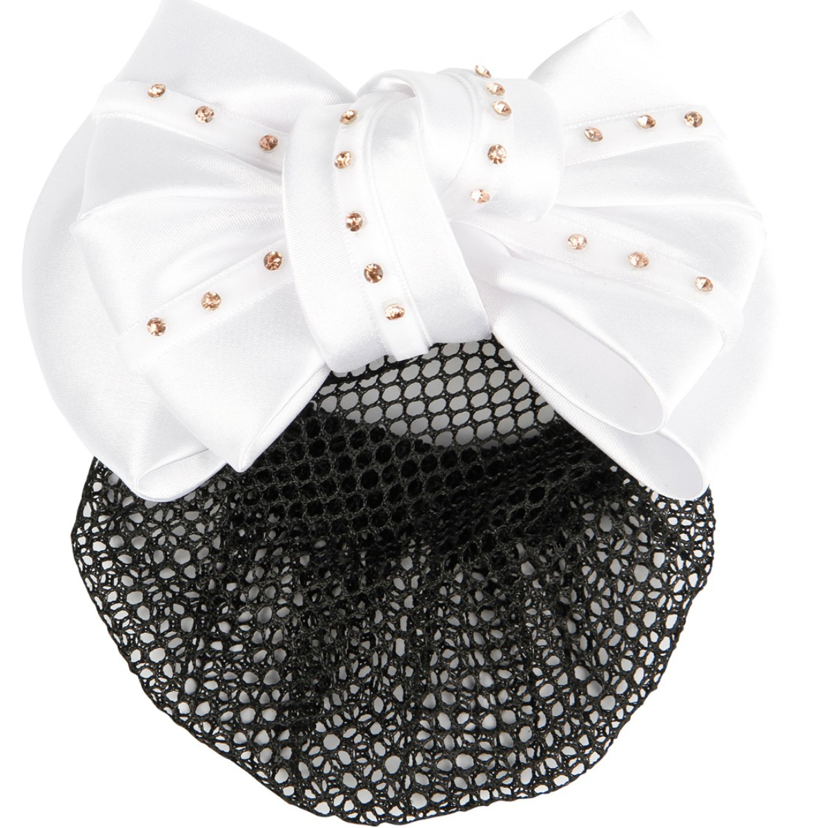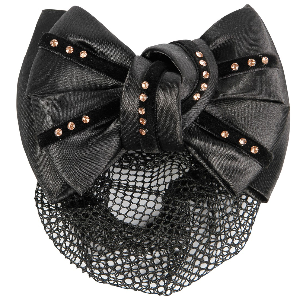 Роскошный бант для выступлений с сеткой для волос. Украшен стразами. Бант удобен для использования под шлемом или цилиндром.