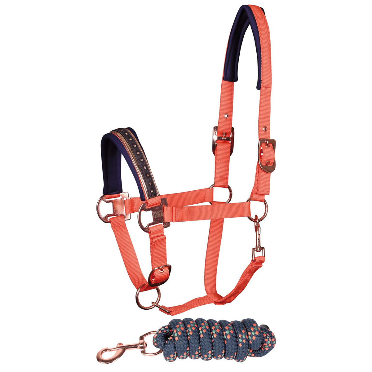 Красивый двухцветный комплект из недоуздка и чумбура (Halter set with rope) из прочного полиэстера, с красивой отделкой кристаллами на капсюле. Ремни на затылке и переносице и подбородке регулируются, что обеспечивает идеальную посадку на голове лошади. Карабин для удобства одевания. Также затылочный и носовой ремни имеют мягкую неопреновую подложку, что предотвращает натирание. В комплекте прочный чумбур на карабине.