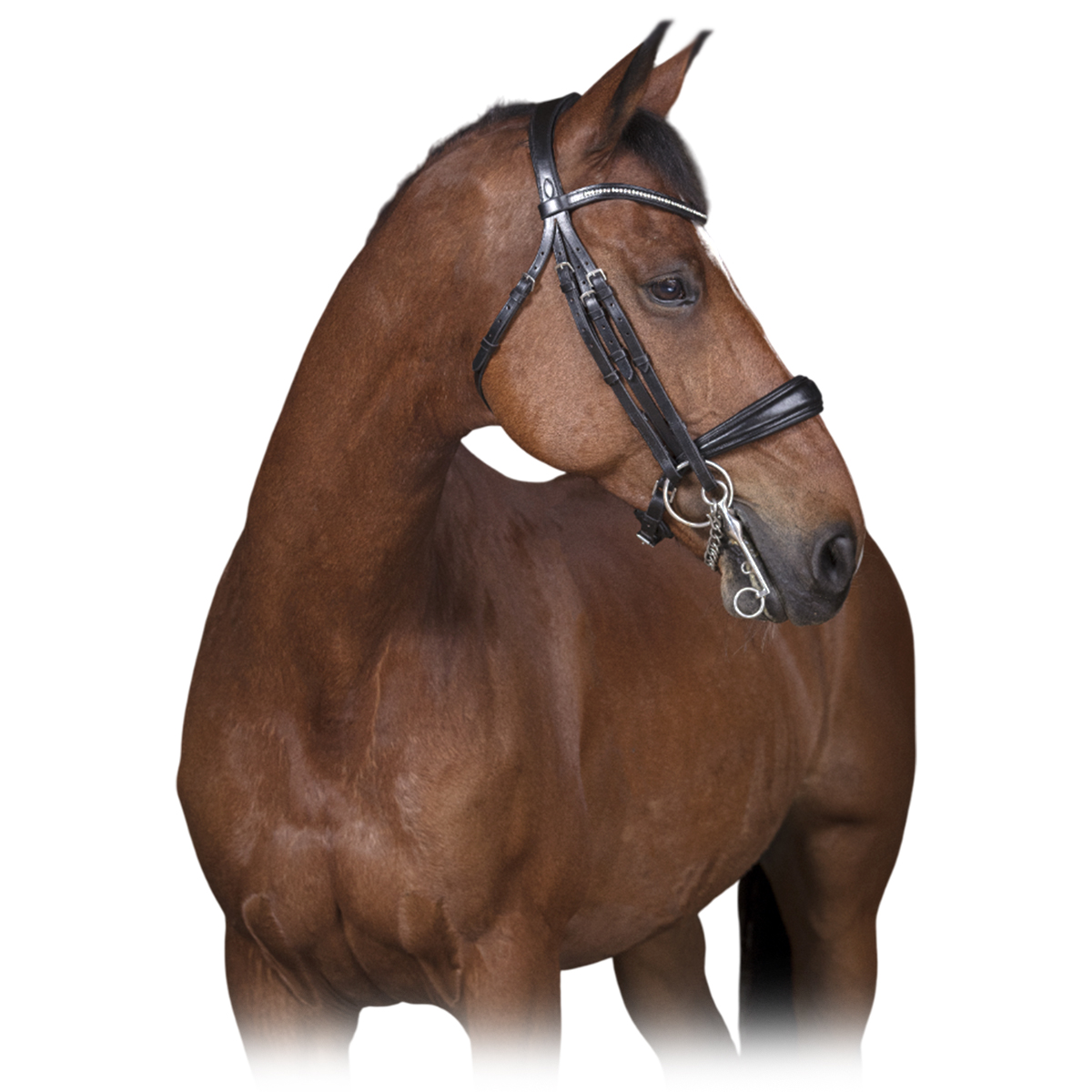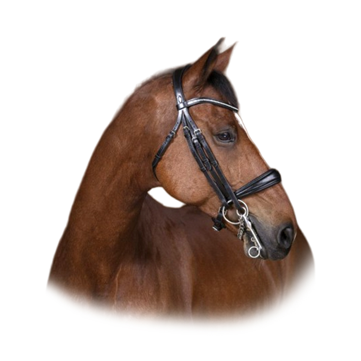 Оголовье выполнено из высококачественной кожи. Налобный ремень украшен стразами. Нащечные ремни на застежках. Пряжки выполнены из нержавеющей стали.