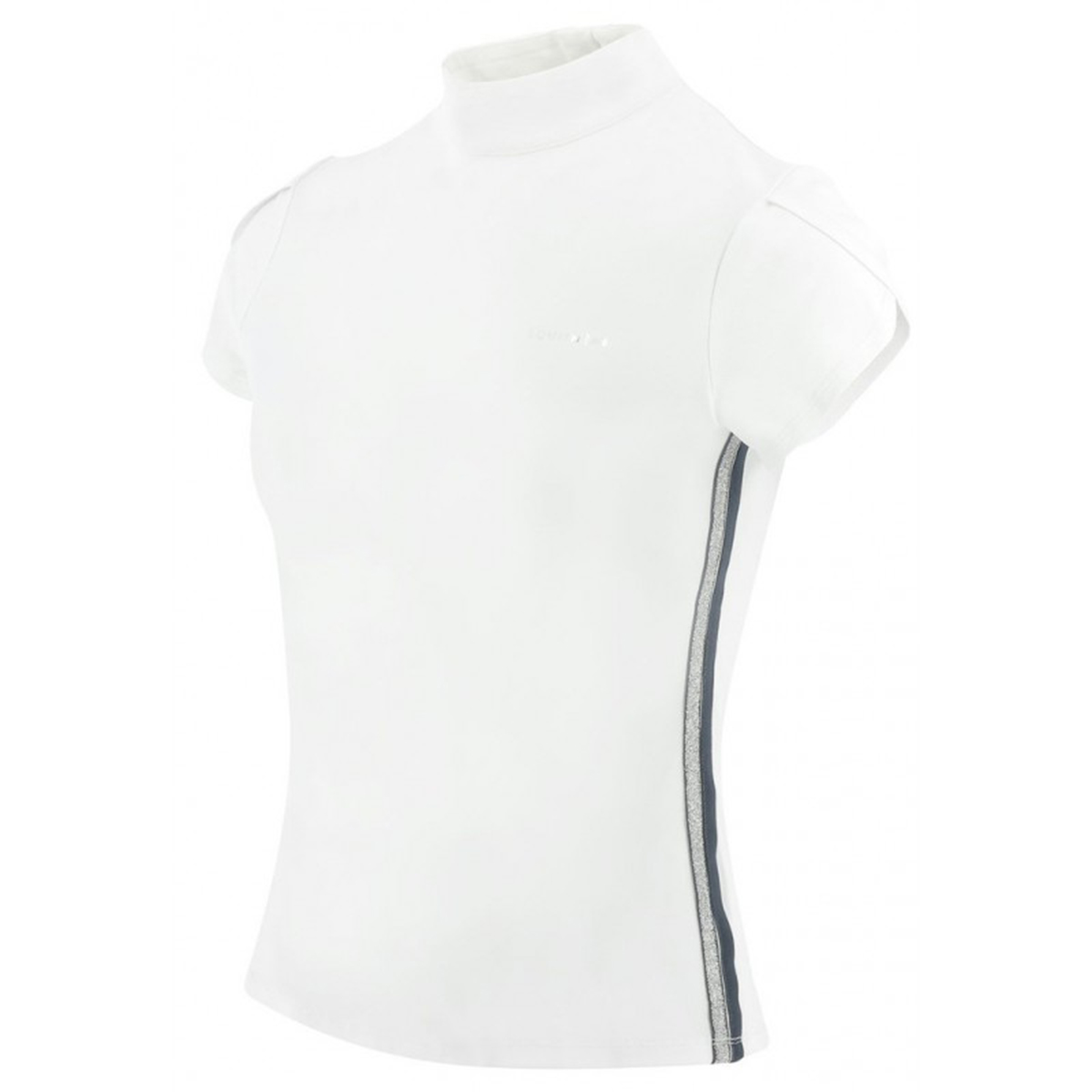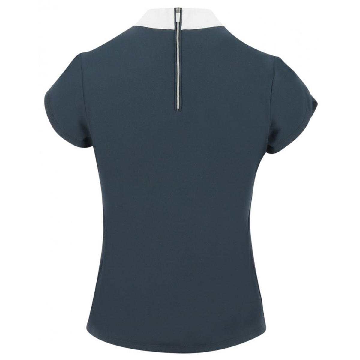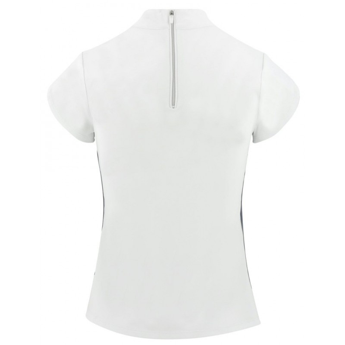 Элегантная рубашка для выступлений (Competition blouse). С короткими рукавами-"тюльпанами" и изящным воротничком-стойкой. Выполнена из эластичного дышащего материала, отводящего влагу и обеспечивающего свободу движений. Украшена контрастными полосами по бокам. Легко надевать и снимать, благодаря небольшой молнии на спинке.