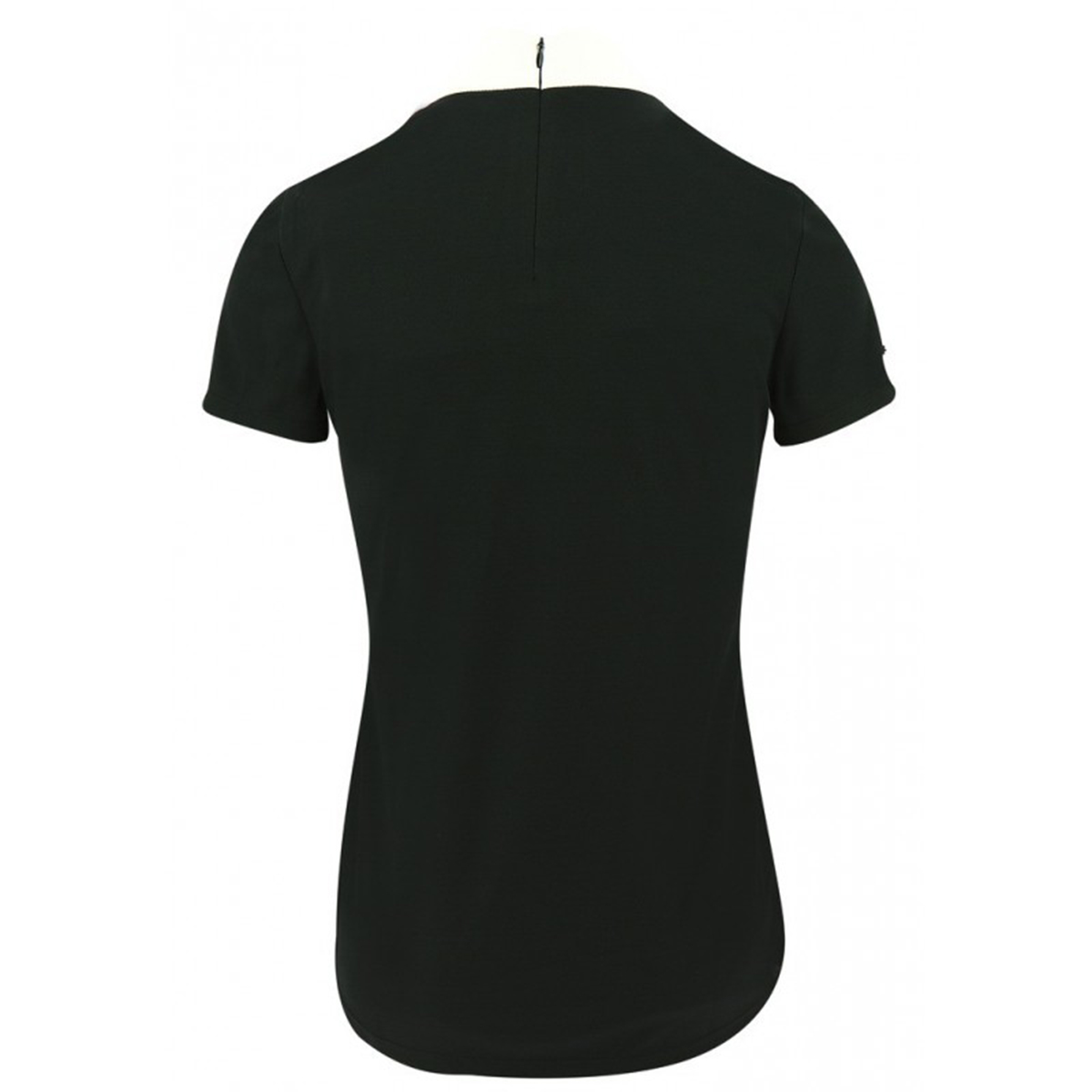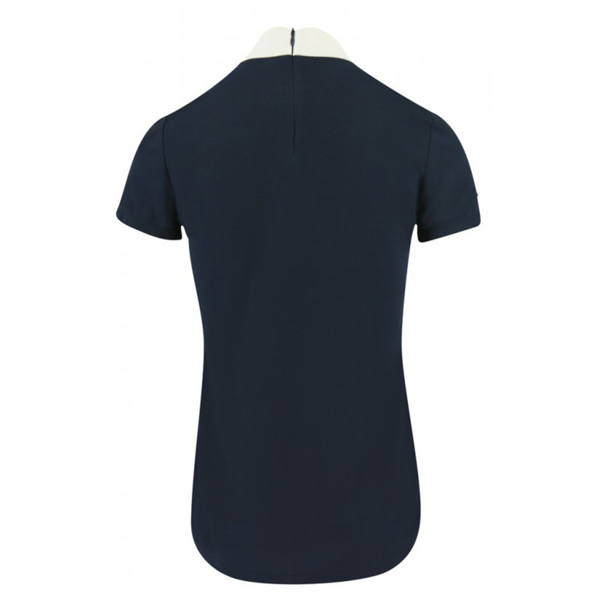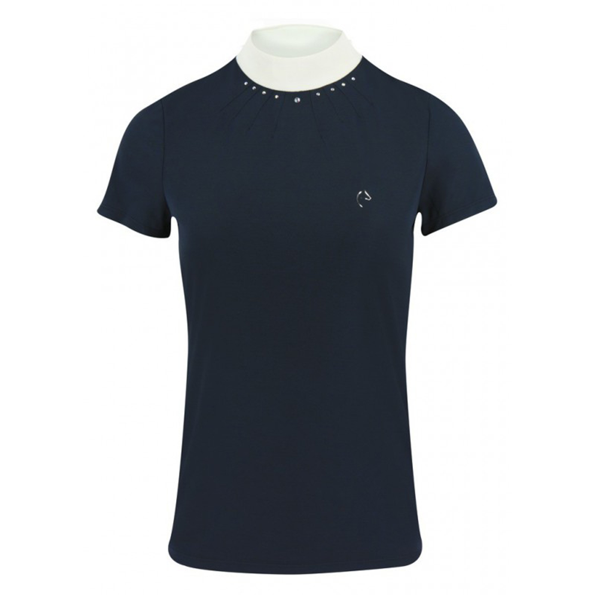 Элегантная рубашка с коротким рукавом для выступлений (Competition shirt). Украшена логотипом на груди, небольшим металлическим лого "Equithème" на краю правого рукава, а также стразами и стежкой-вытачками под воротничком-стойкой. Застегивается на спинке на небольшую молнию.