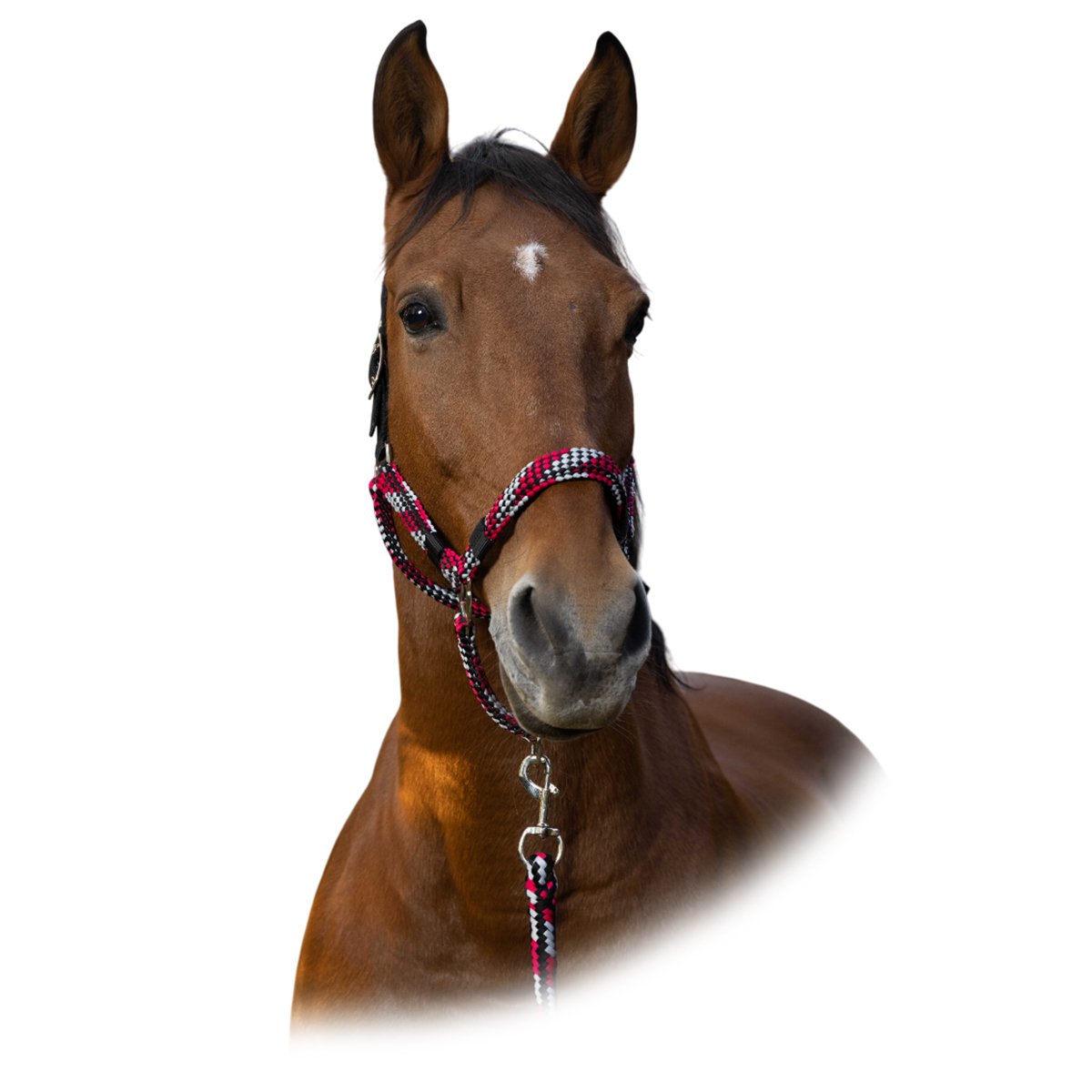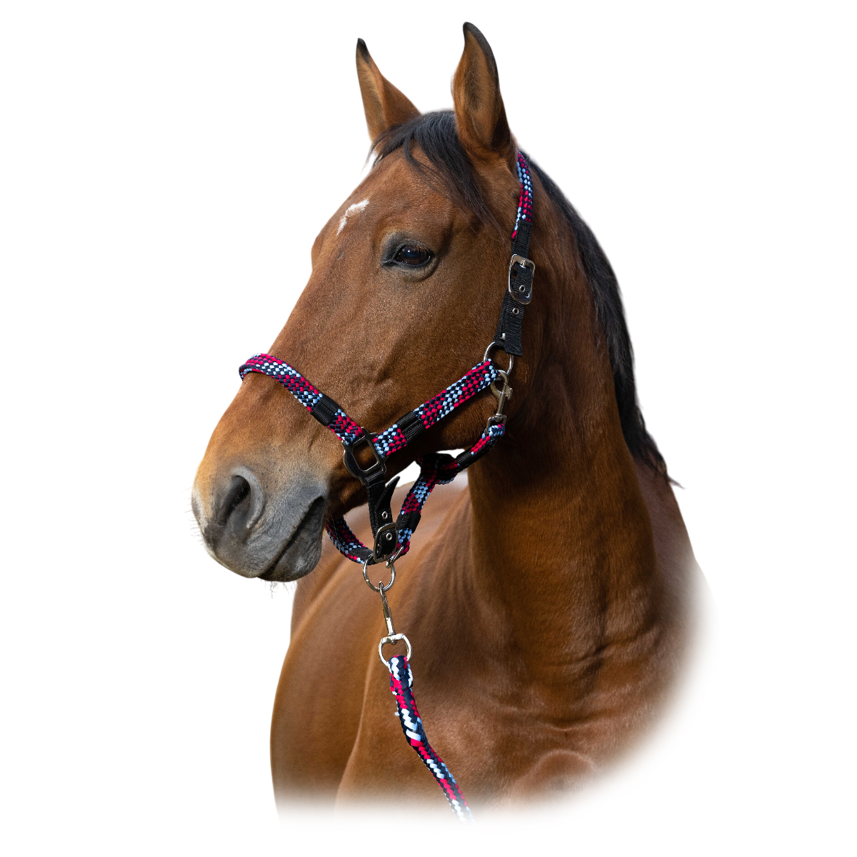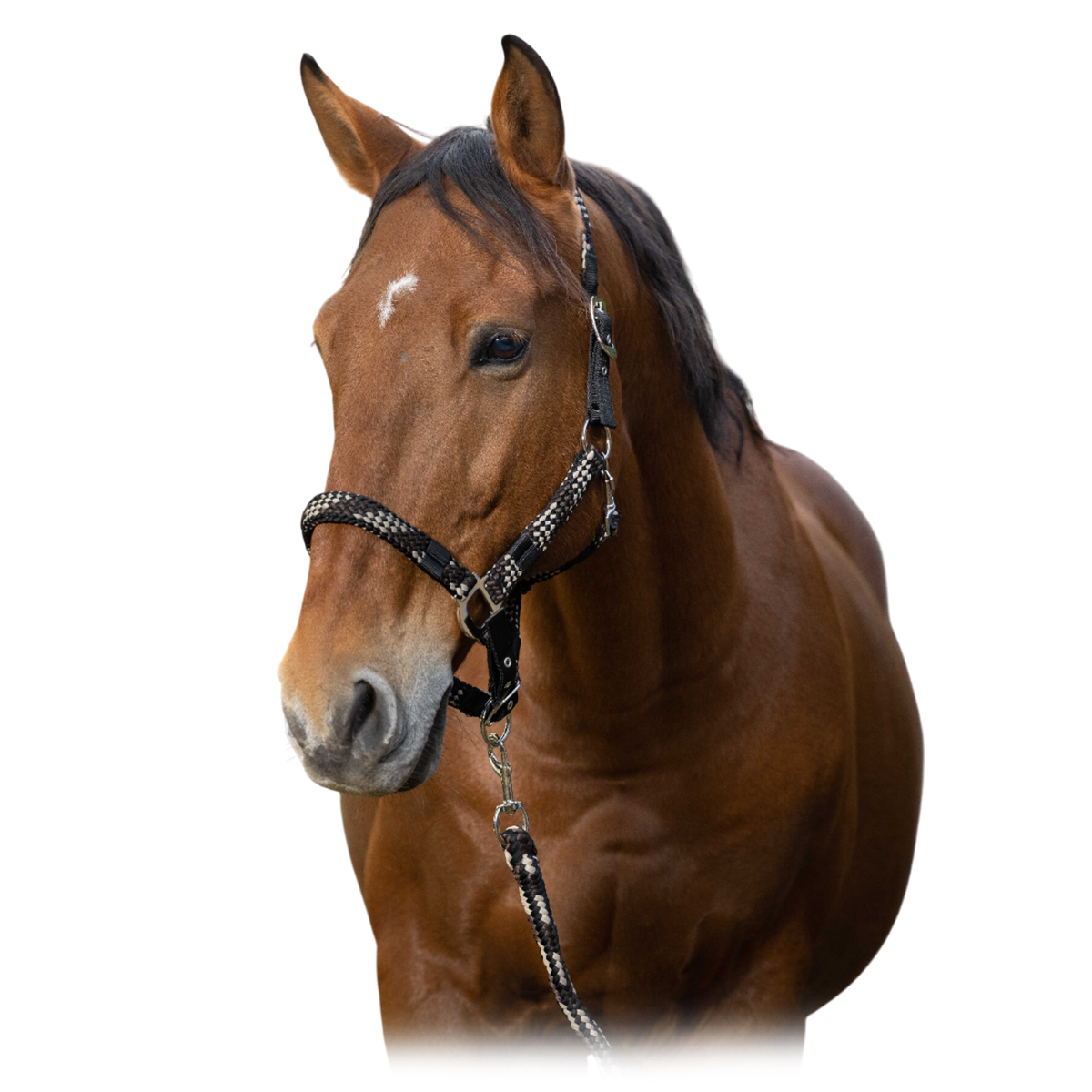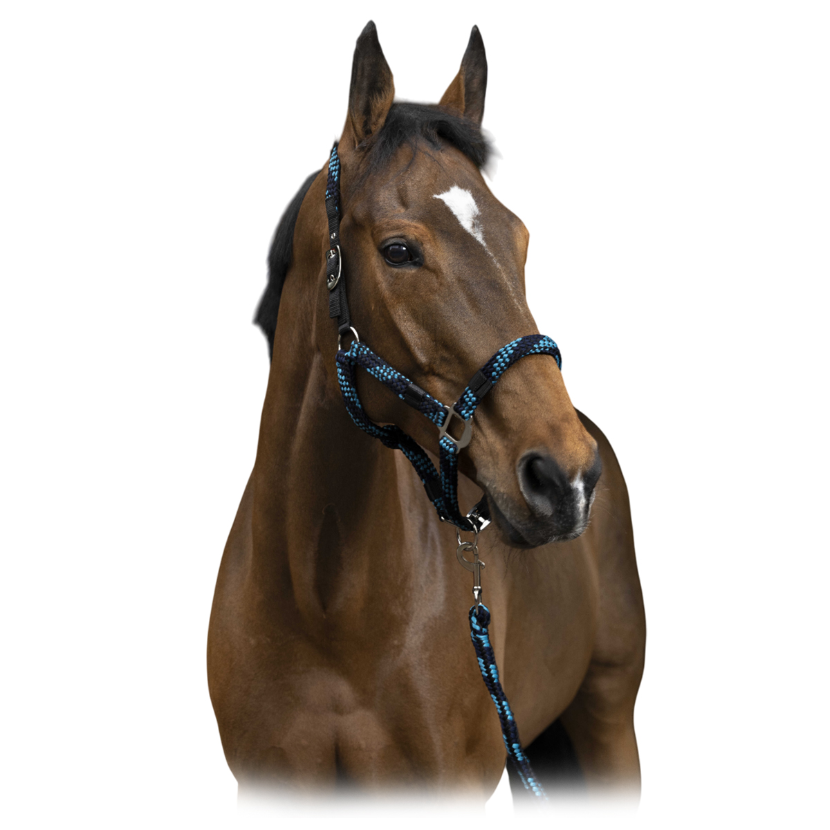 Нейлоновый недоуздок в комплекте с чумбуром (Halter and Lead Set). Ремни на затылке и переносице регулируются, что обеспечивает идеальную посадку на голове лошади, неопреновая подложка предотвращает натирание. В комплекте чумбур из мягкого нейлона, длиной 2,2 м с простым карабином. Фурнитура серебристого цвета.