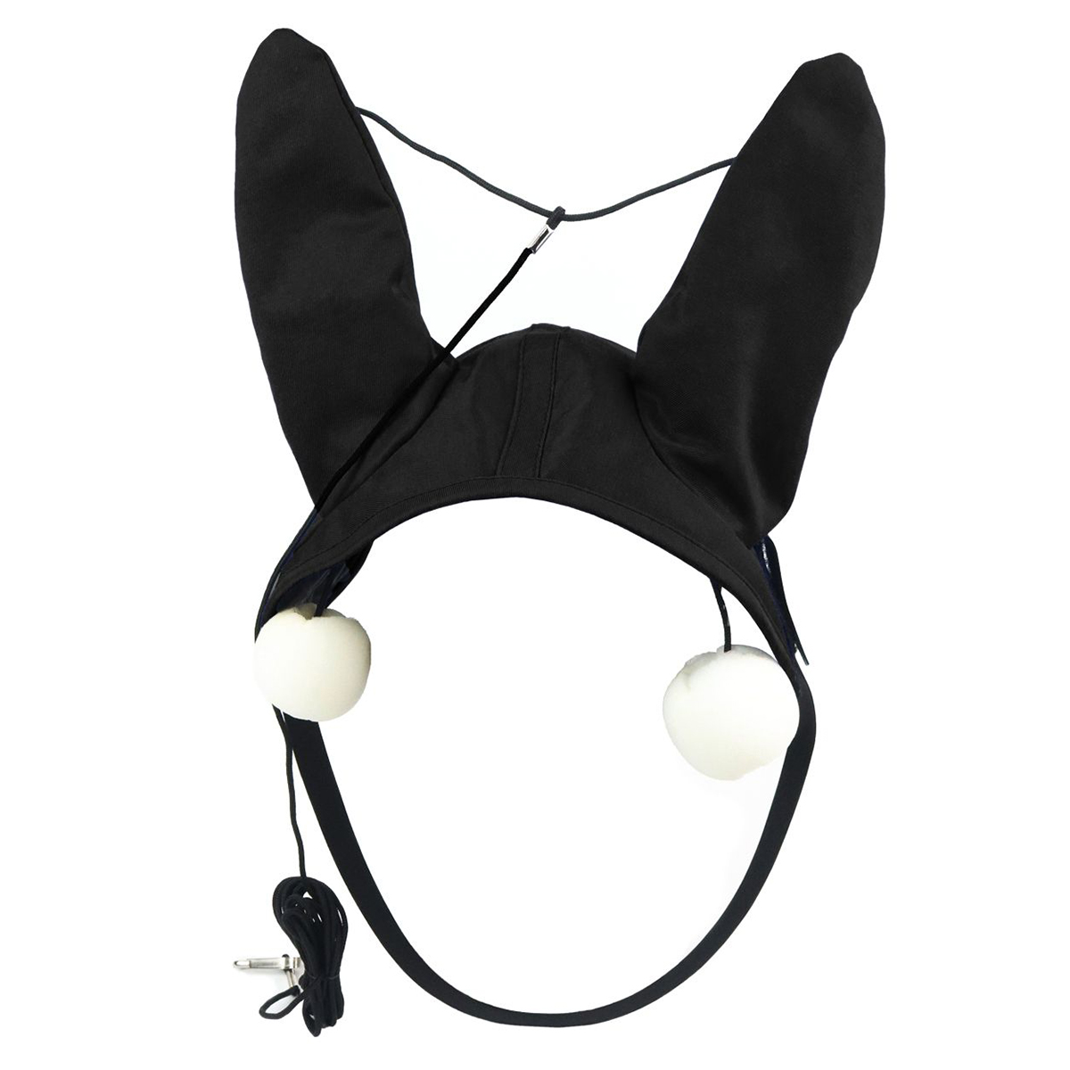 Наушники из полиэстера для рысаков с "телефоном". Применяется для ограничения слуха. При необходимости поролоновые вкладки в уши ("телефоны") легко вынимаются наездником с помощью шнуров. Регулируются ремешком на липучке для удобного крепления вокруг челюсти. Расстояние между ушами составляет 10 см.