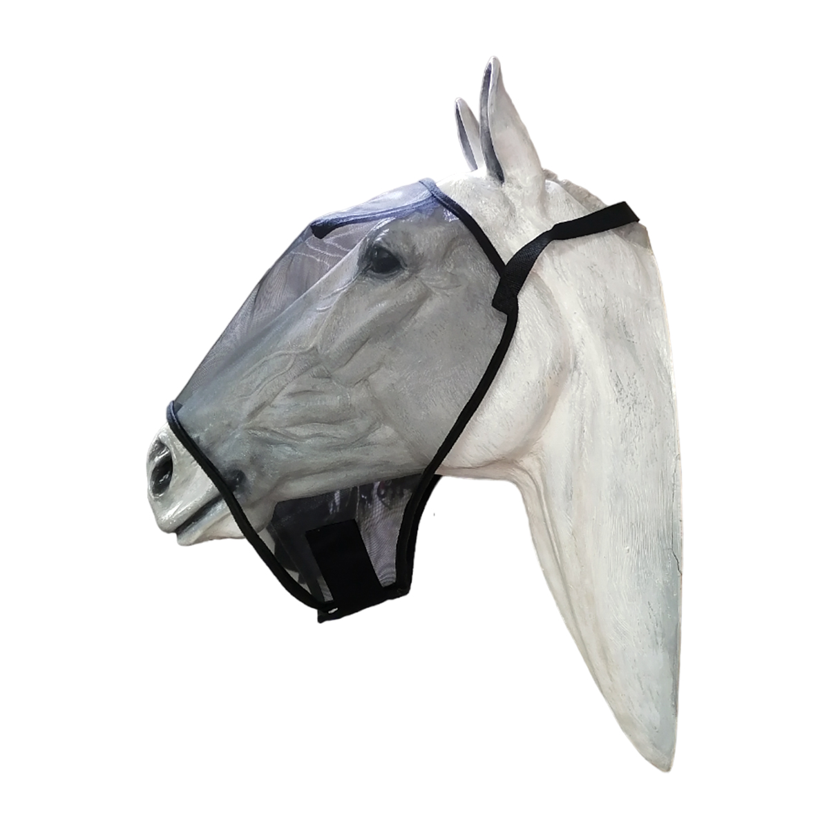 Маска от летающих насекомых (Fly Mask with ears) из сетки. Без ушек и носа. Крепится резинкой на затылке. Застегивается на липучку на подбородной части. Под маску можно одеть недоуздок или оголовье.