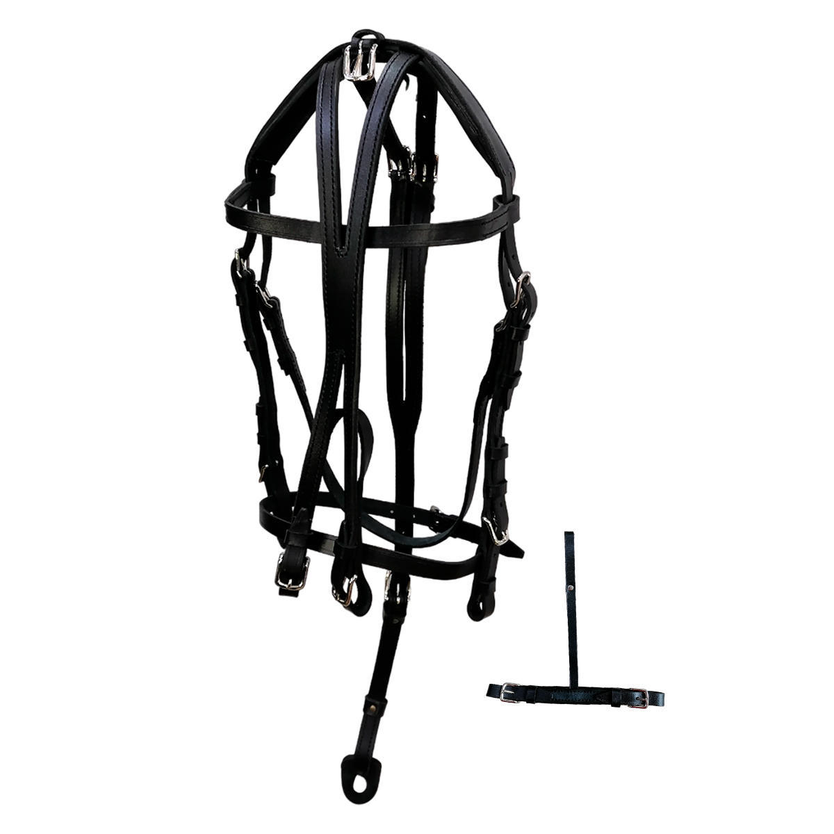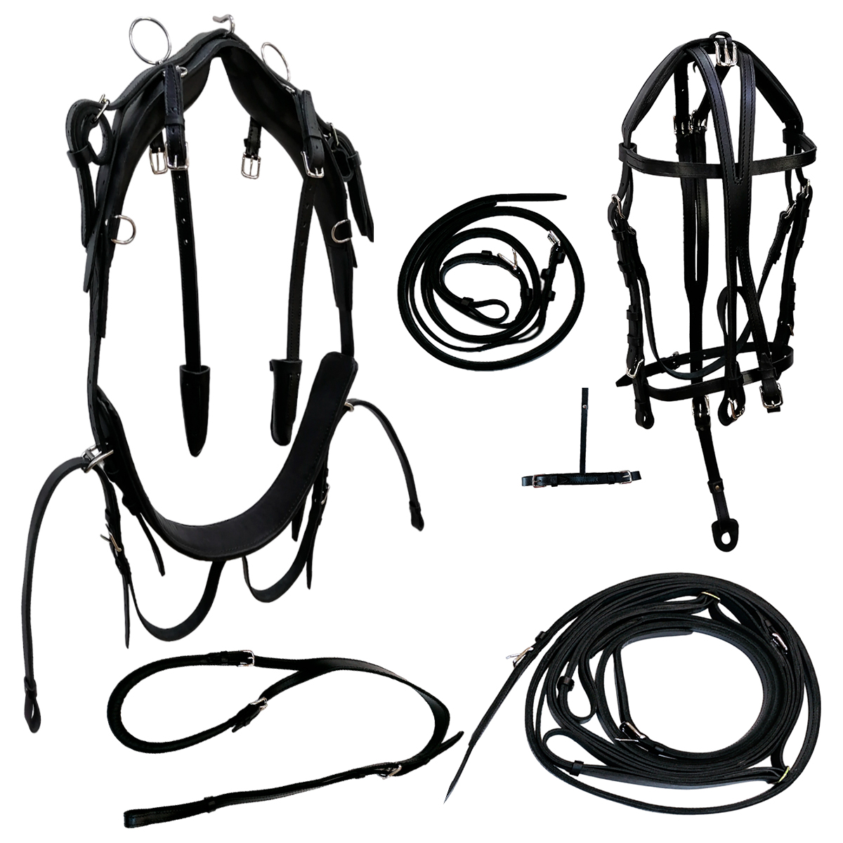 В комплект входит: кожаная седелка, кожаная подпруга, кожаная пахва с петлей для хвоста, кожаный нагрудник, вожжи, кожаная уздечка с оверчеком и подбородным ремнем.