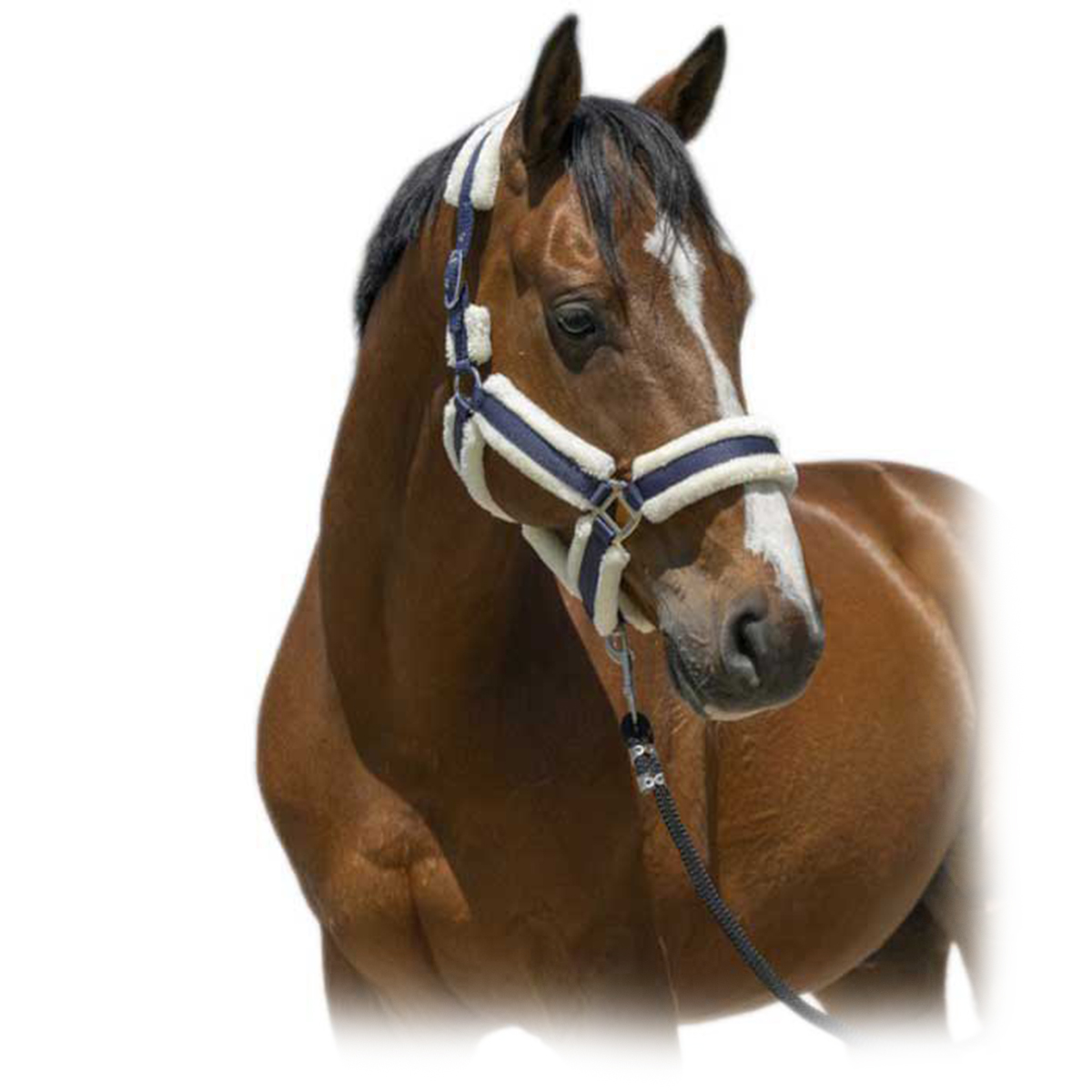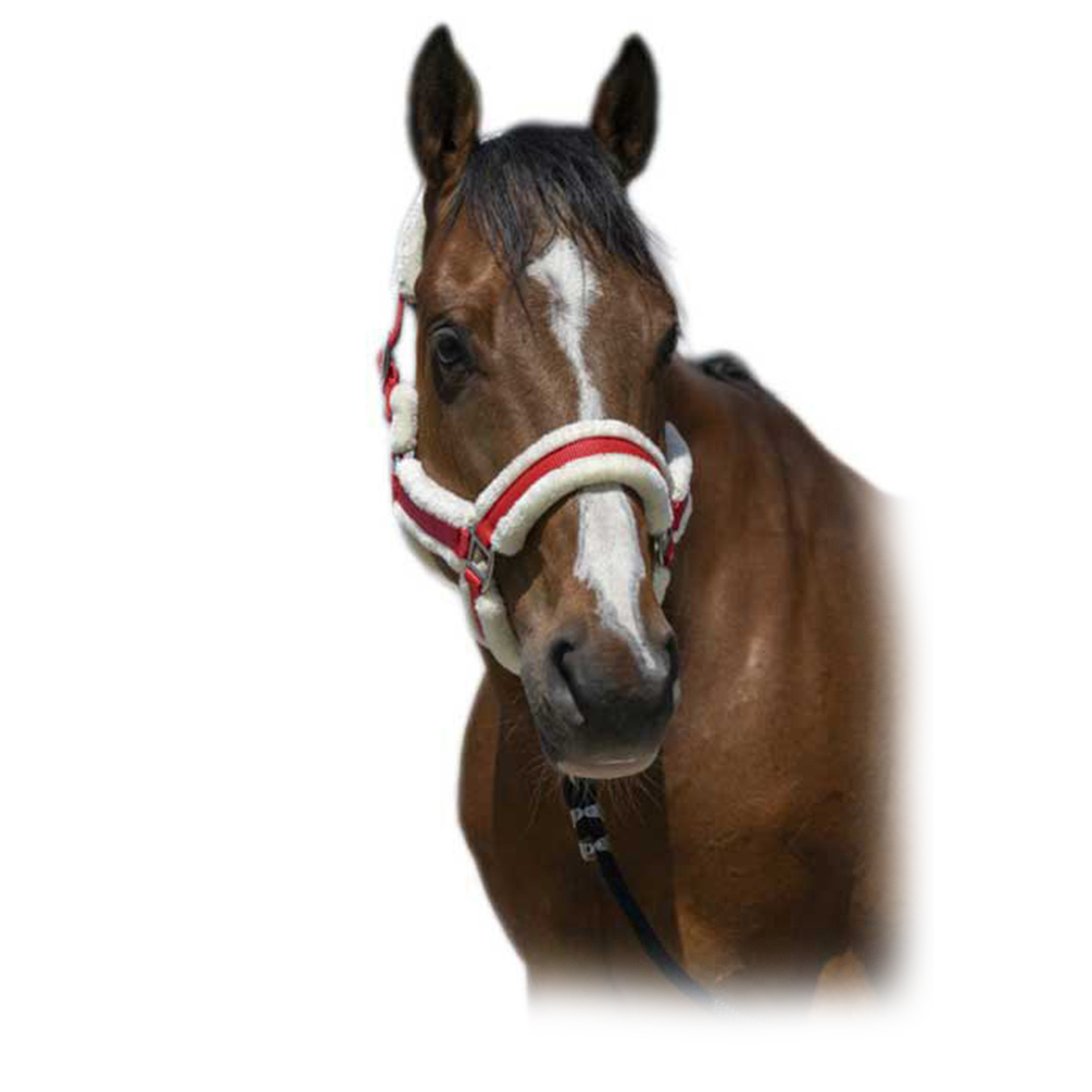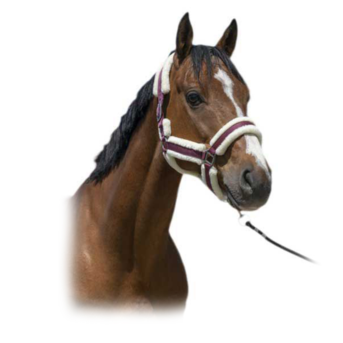 Нейлоновый недоуздок с подкладками из искусственного меха.(Halter with plush padding). Меховые подложки предотвращают натирание. Затылочный ремень регулируется пряжками с двух сторон, что обеспечивает идеальную посадку на голове лошади. Качественный плотный материал недоуздка и прочная металлическая фурнитура продлят срок службы недоуздка. Застегивается на карабин, что упрощает процесс одевания.