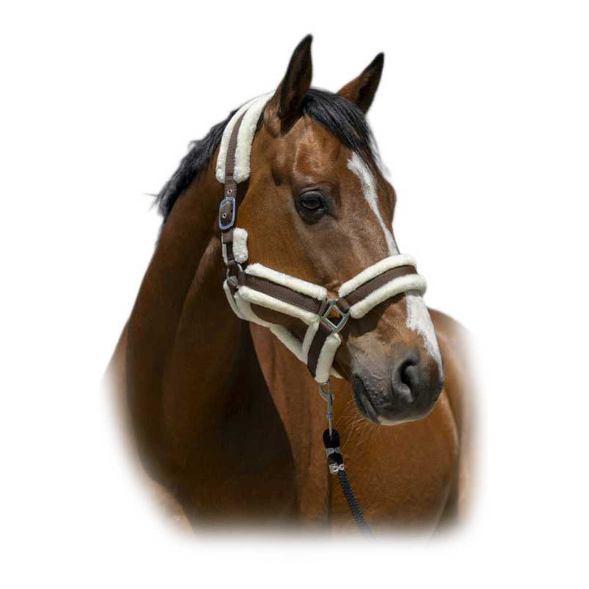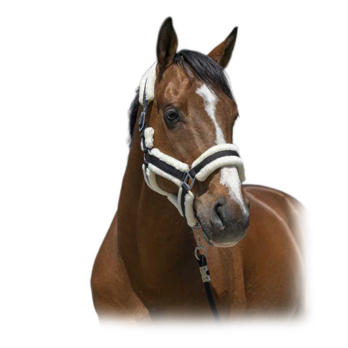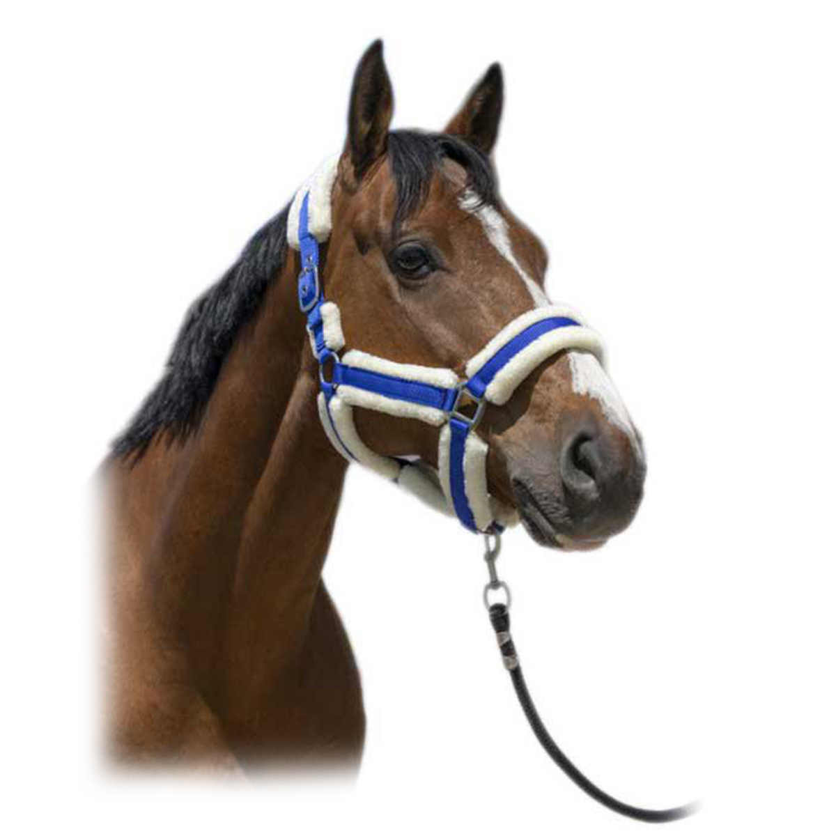 Нейлоновый недоуздок с подкладками из искусственного меха.(Halter with plush padding). Меховые подложки предотвращают натирание. Затылочный ремень регулируется пряжками с двух сторон, что обеспечивает идеальную посадку на голове лошади. Качественный плотный материал недоуздка и прочная металлическая фурнитура продлят срок службы недоуздка. Застегивается на карабин, что упрощает процесс одевания.