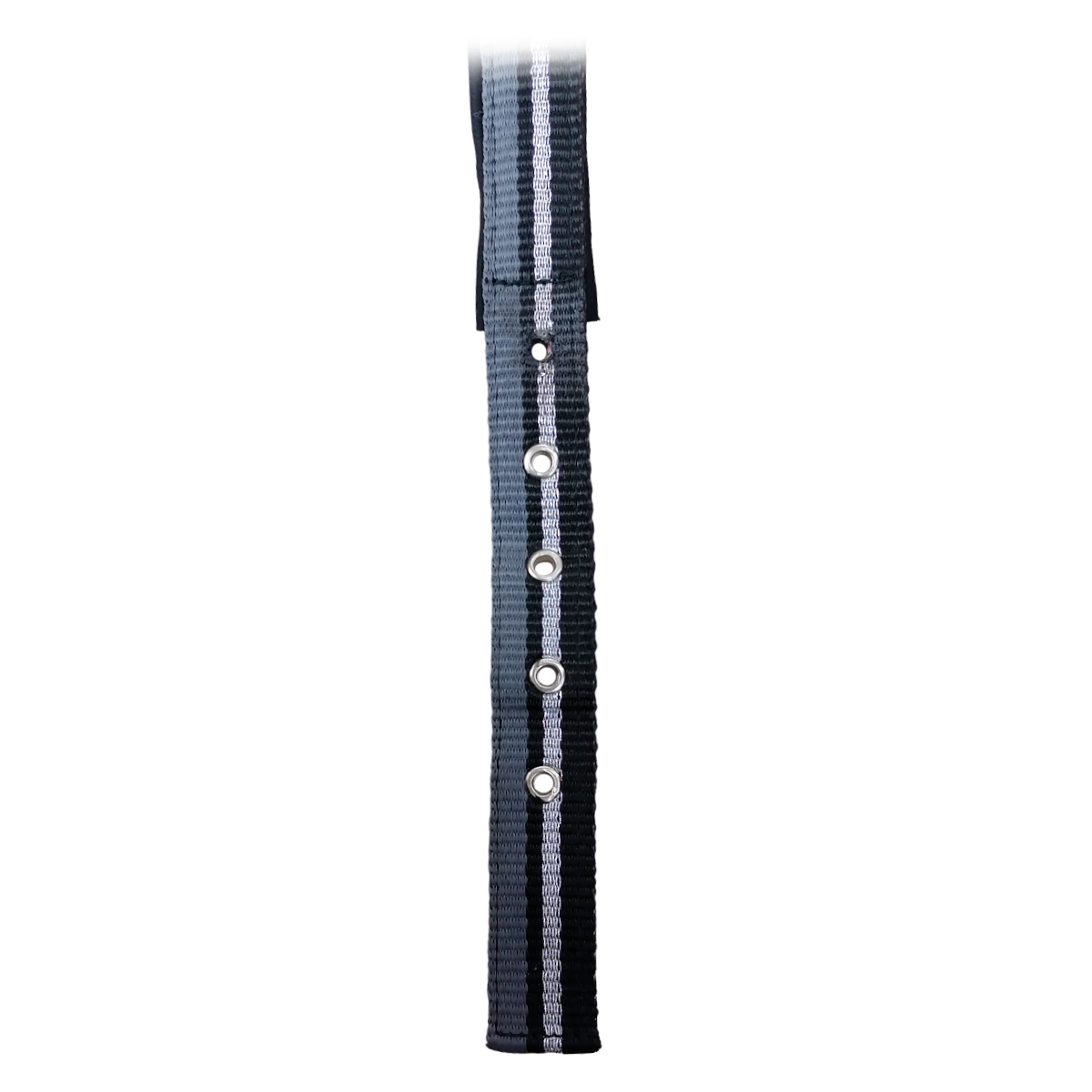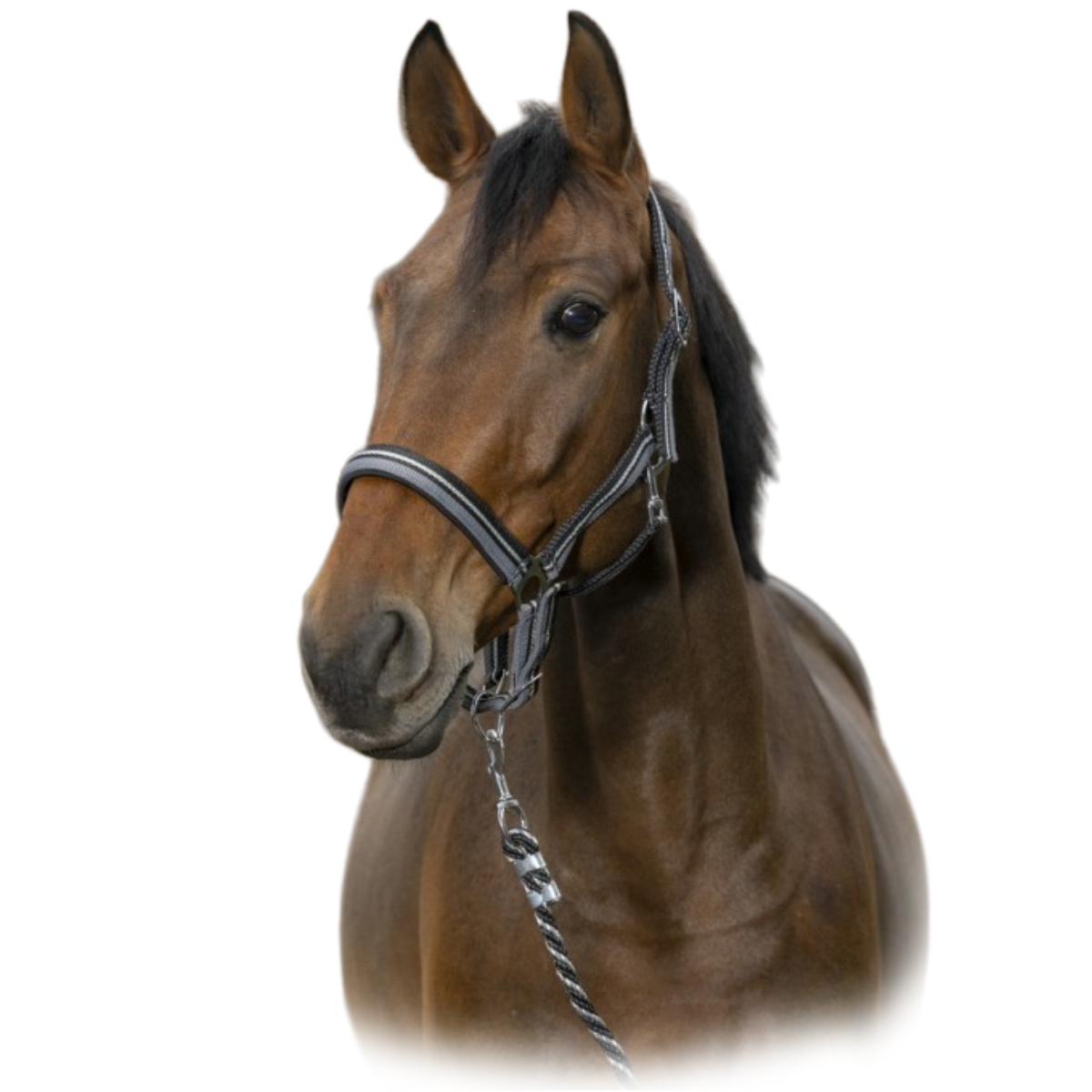 Нейлоновый недоуздок в комплекте с чумбуром (Halter and Lead Set). Ремни на затылке и переносице регулируются, что обеспечивает идеальную посадку на голове лошади, неопреновая подложка предотвращает натирание. В комплекте чумбур из мягкого нейлона, длиной 2,5 м с простым карабином. Фурнитура серебристого цвета.