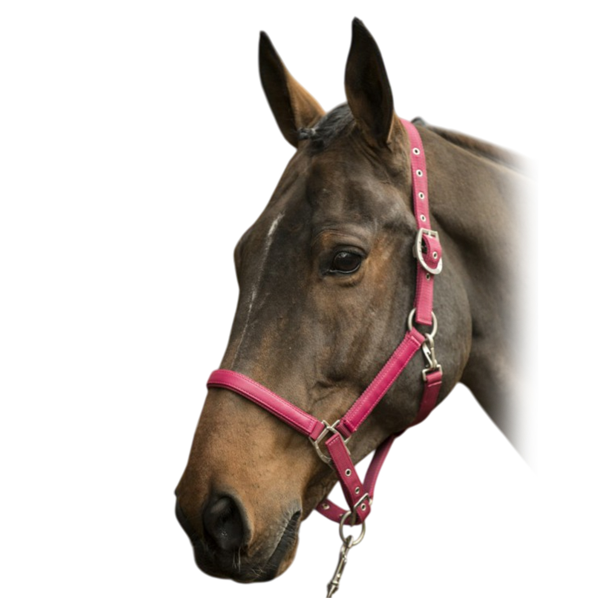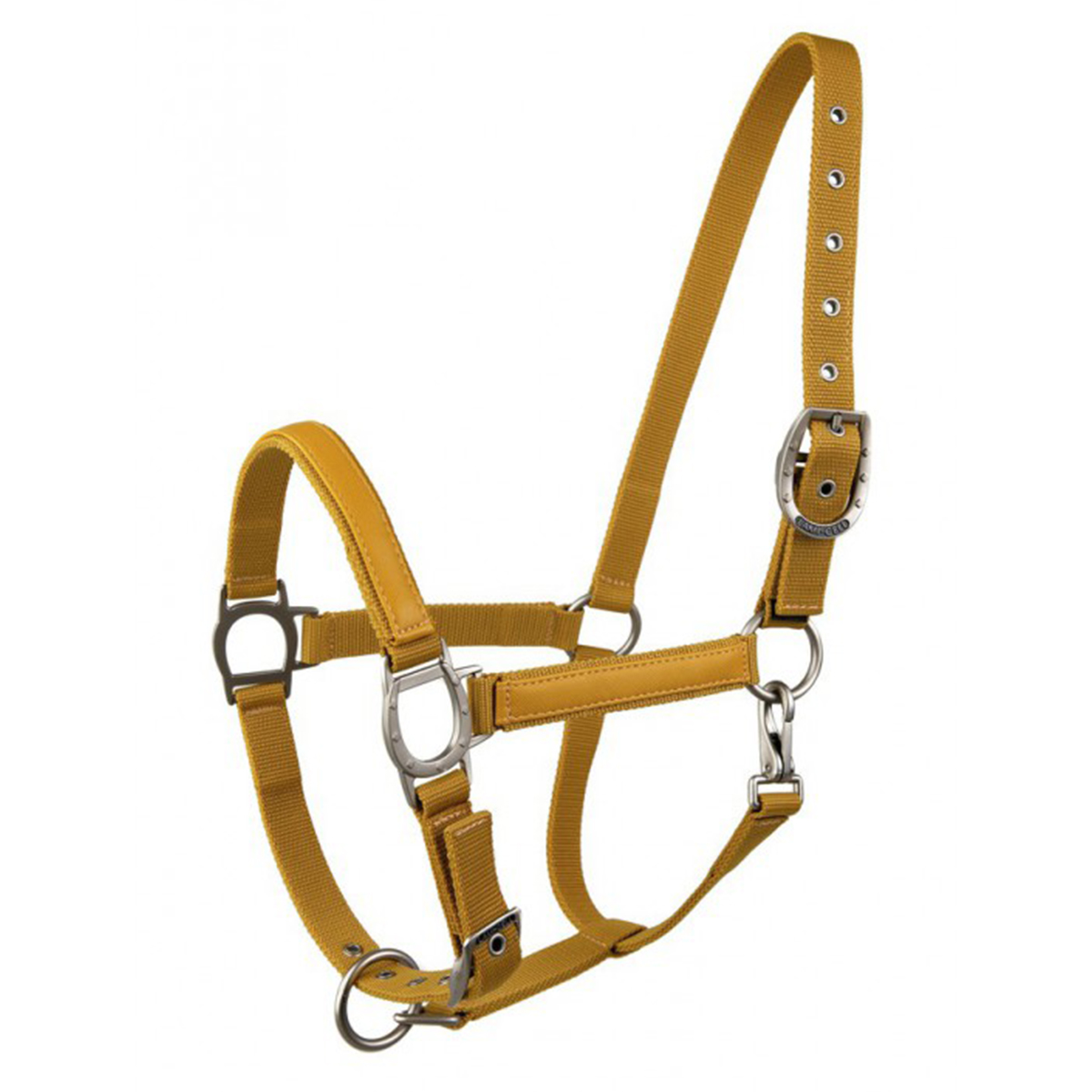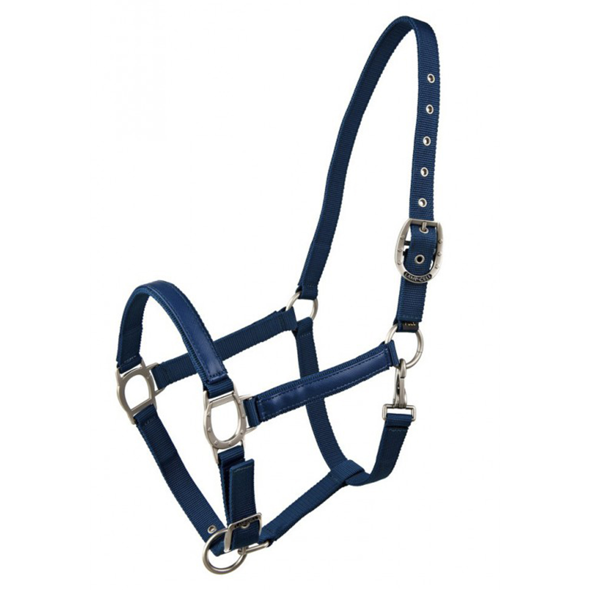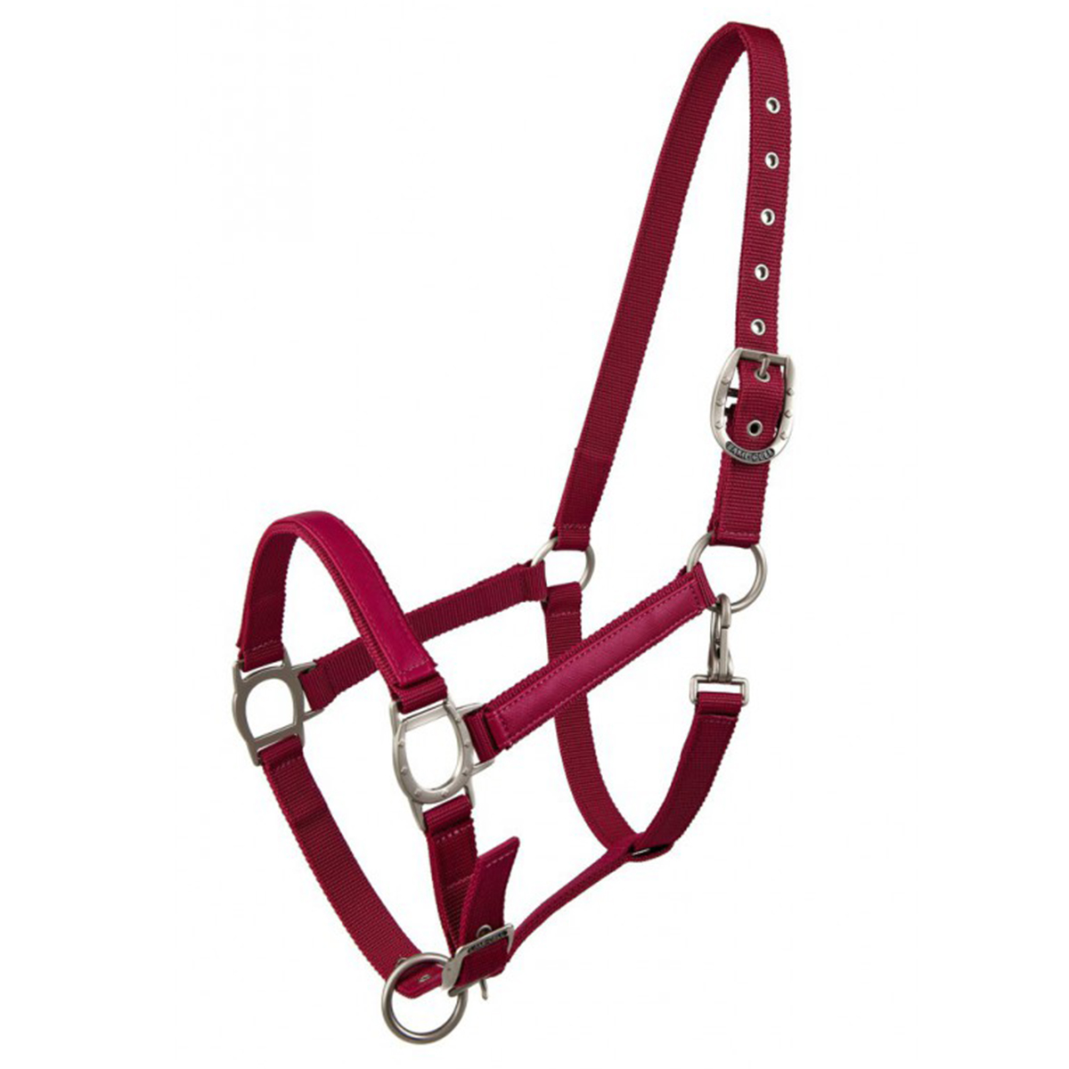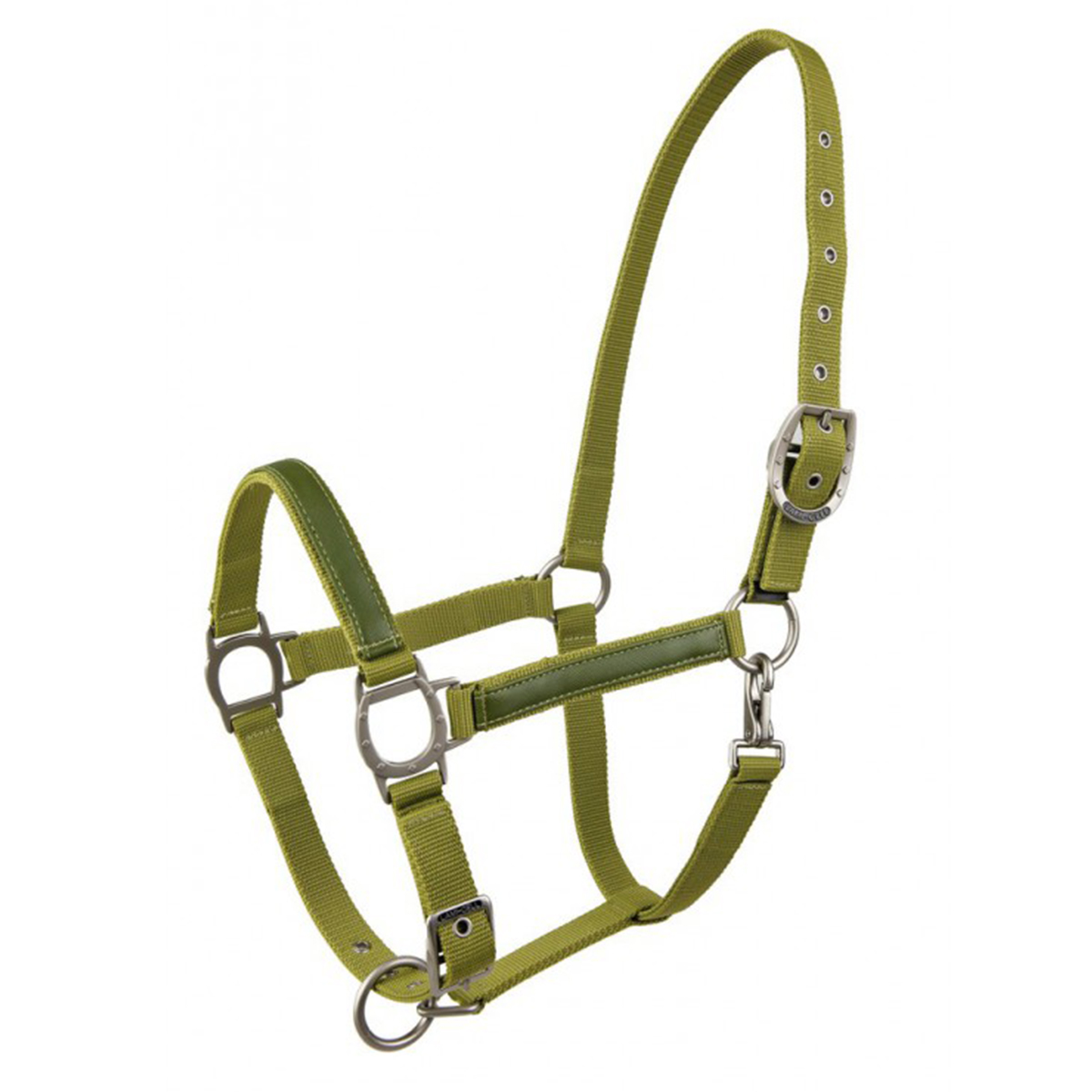 Прочный недоуздок из высококачественного нейлона (Halter). Затылочный и носовой ремени регулируются, что обеспечивает идеальную посадку на голове лошади. Эти ремни имеют замшевую подложку, которая позволяет избежать натирания. Носовой и нащечные ремни украшены вставкой из искусственной кожи. Металлические пряжки серебристого цвета в виде подковы.
