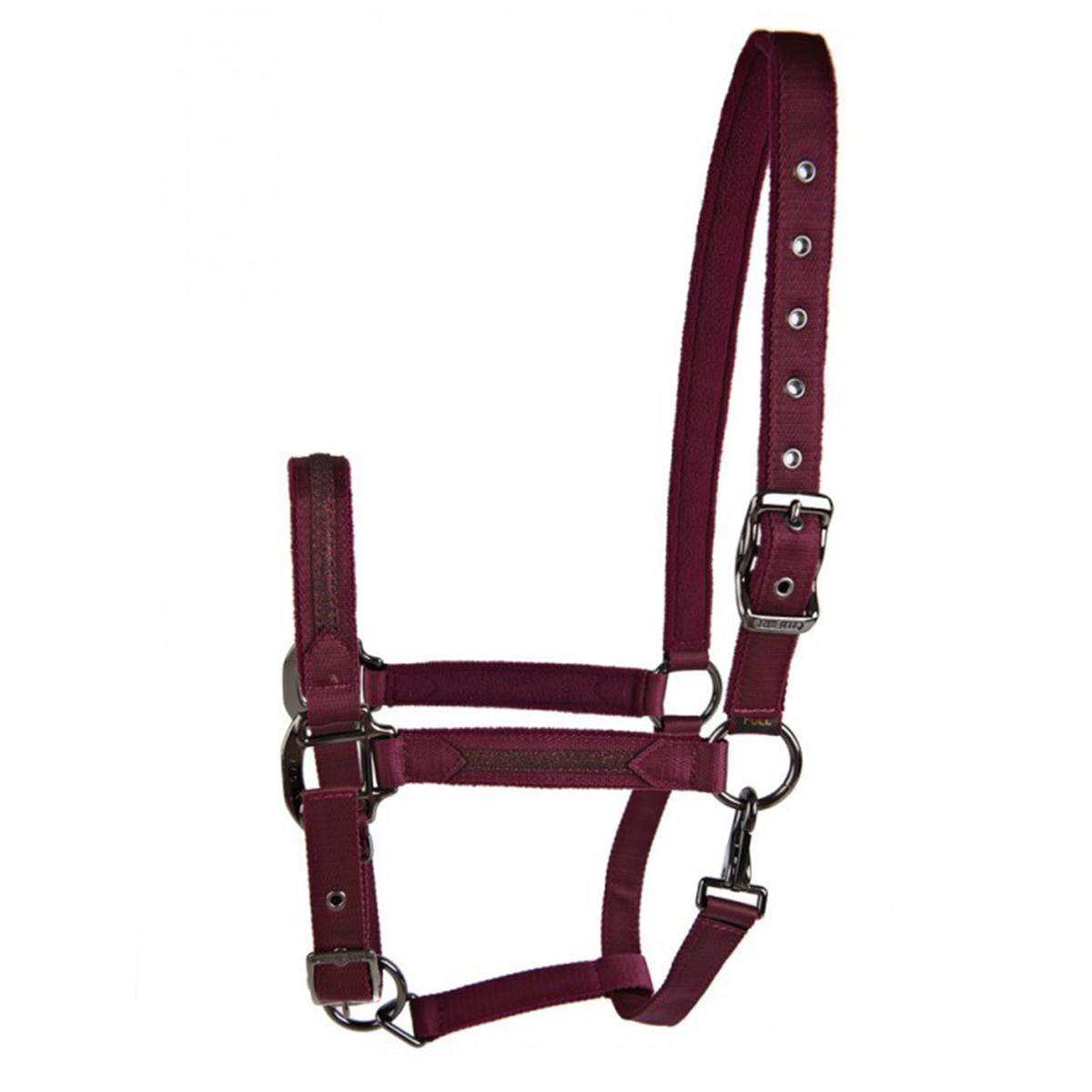 Прочный недоуздок из высококачественного нейлона (Halter). Затылочный и носовой ремени регулируются, что обеспечивает идеальную посадку на голове лошади. Эти ремни имеют подложку из искусственной замши, которая позволяет избежать натирания. Украшен блестящими декоративными вставками. Металлические пряжки темно-серого цвета.