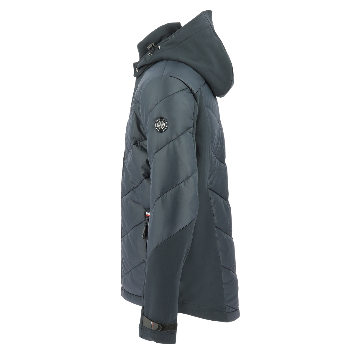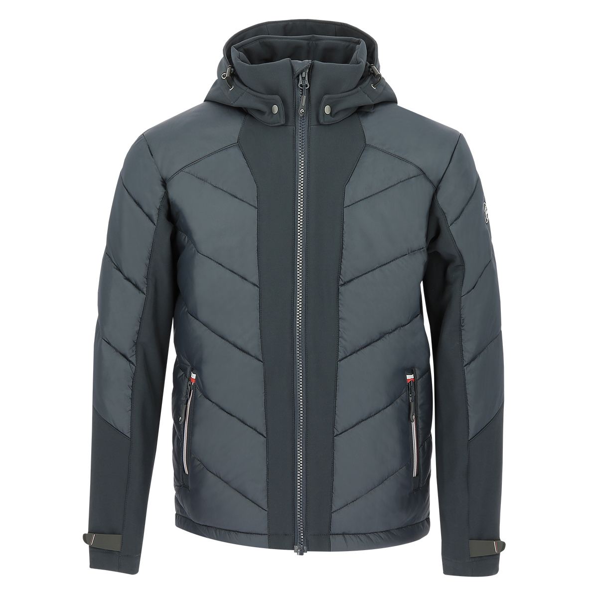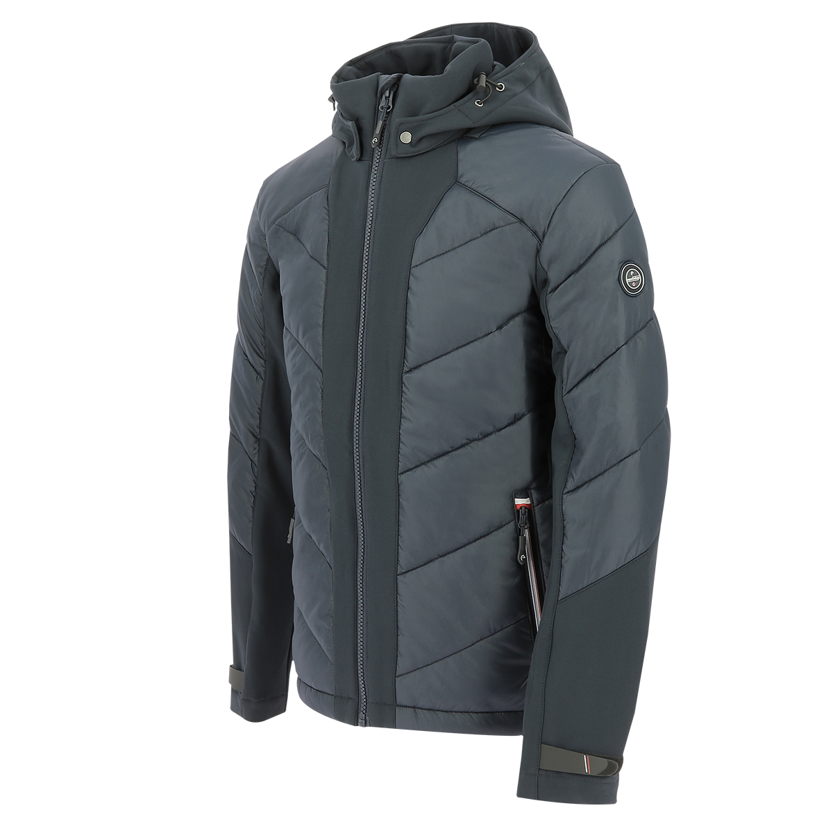 Куртка мужская (jacket) в спортивном стиле. Водоотталкивающая, из воздухопроницаемого материала на подкладке из полиэфирного волокна. Контрастные вставки на рукавах, груди и спине из трикотажа softshell. Липучка на запястьях. Высокий воротник с молнией по всей высоте. Отстегивающийся капюшон на утяжках. 2 наружных кармана и 1 внутренний карман на молнии.