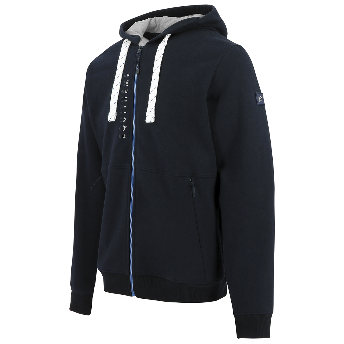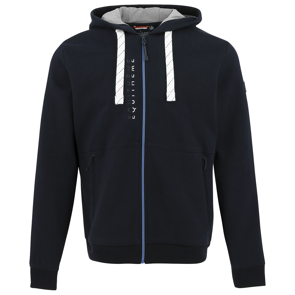 Мужская толстовка для верховой езды (Men's Jacket) на флисовом подкладе с капюшоном. Застегивается на молнию. Капюшон с подкладкой серого цвета, регулируемый контрастным шнурком. Два боковых кармана на молнии. Толстовка смотрится стильно благодаря вертикальной силиконовой 3D печати на груди.