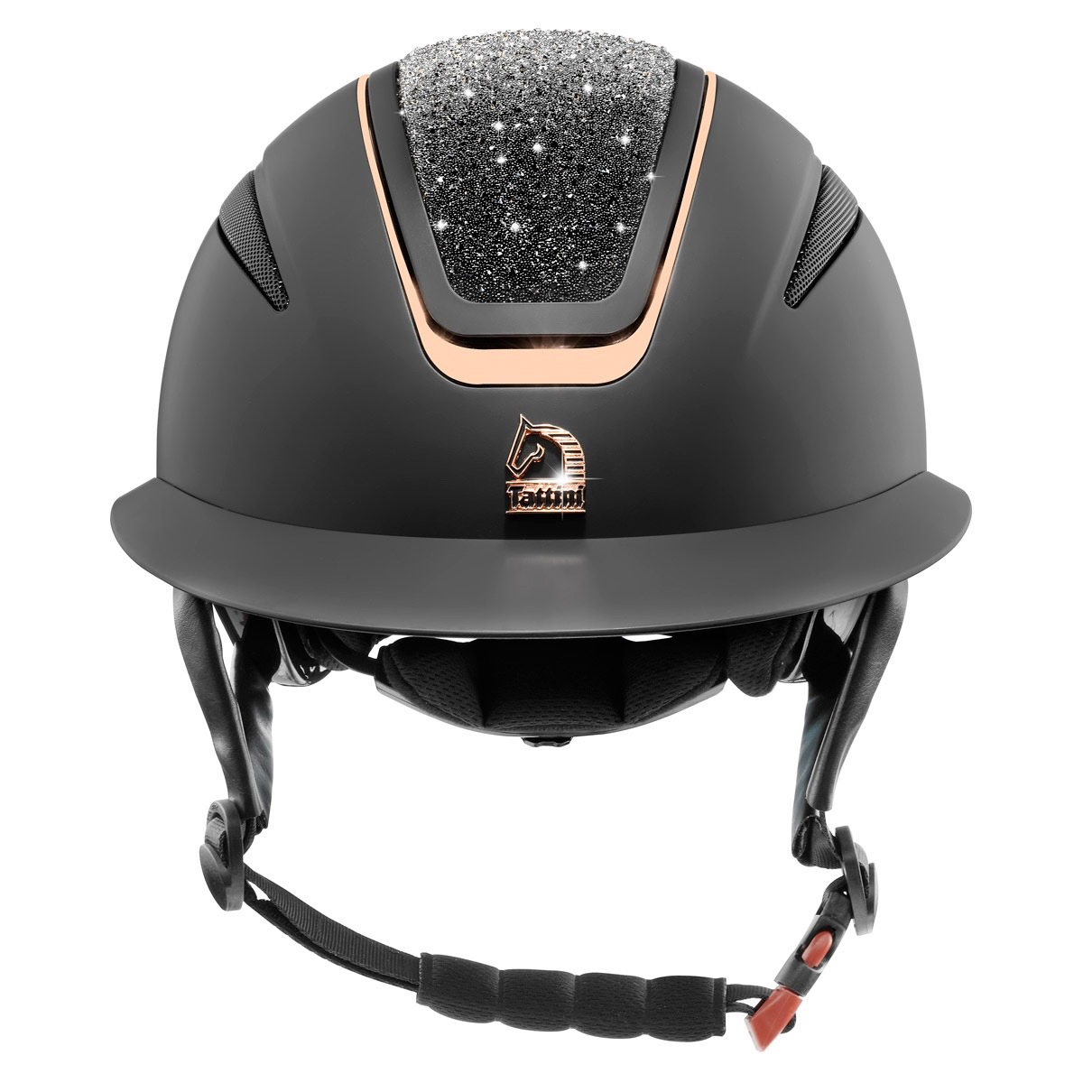 Стильный легкий защитный регулируемый шлем (adjustable helmet for rider) для занятий верховой ездой. Оснащен широким козырьком и сквозной системой вентиляции. Имеет блестящую панель посередине с окантовкой цвета розовое золото. Верх из устойчивого к повреждениям ABS пластика. Амортизирующая основа из EPS (пенополистерол) с покрытием. 4-точки крепления. Удобный крутящийся ролик поможет двумя пальцами отрегулировать размер по объему головы. Отводящая влагу внутренняя подкладка, съемная и пригодная для машинной стирки. Шлем соответствует международному стандарту безопасности CE EN1384.