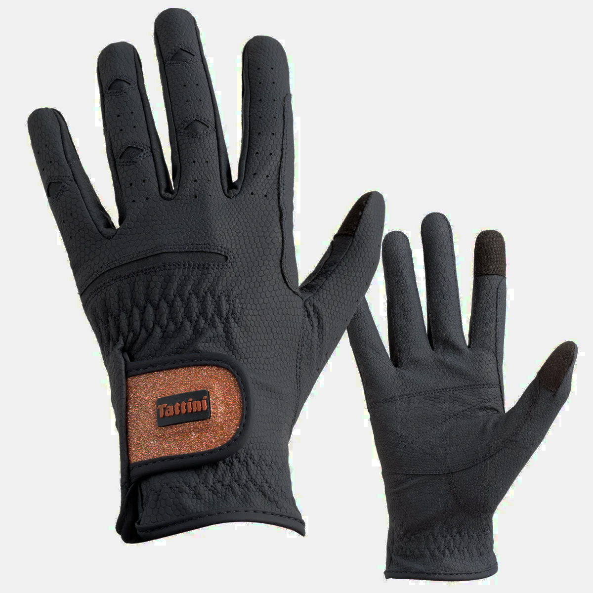 Элегантные перчатки (ridding gloves) для верховой езды от бренда Tattini. Обеспечивают максимальный комфорт и контакт с поводьями. В местах сопрокосновения с поводом перчатки дополнительно укреплены накладками из основного материала. Благодаря эластичным вставкам идеально садятся по руке. Застегиваются на липучку, клапан переливающегося цвета "розовое золото" с логотипом Tattini. Вставки touch screen на указательном и большом пальцах позволяют пользоваться мобильным телефоном, не снимая перчаток.
