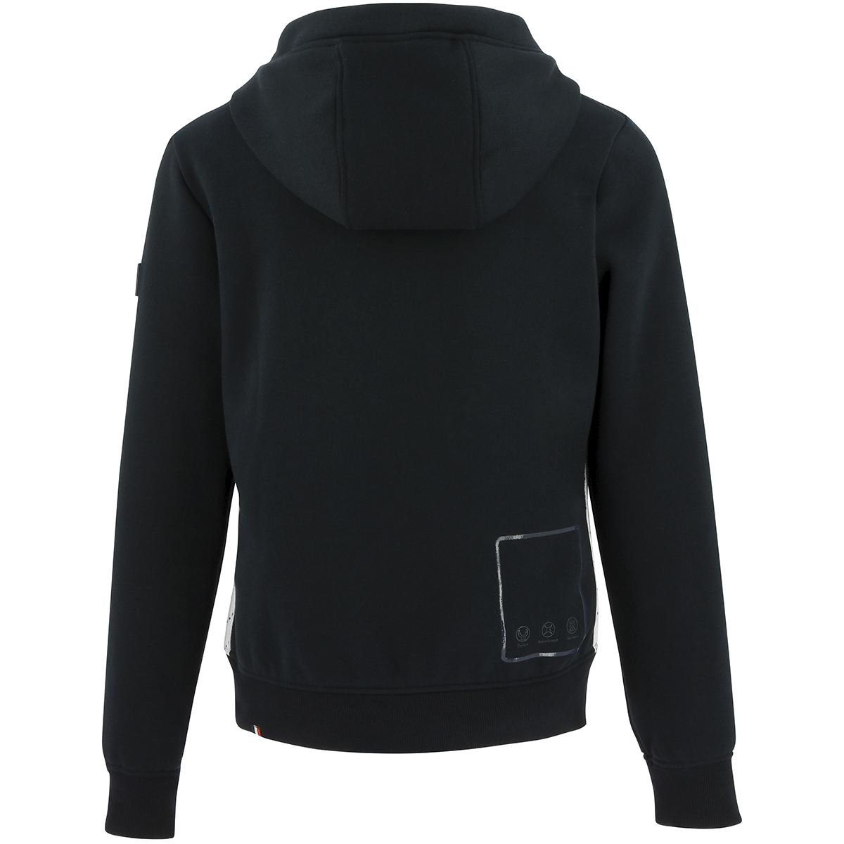 Женская толстовка для верховой езды (Jacket) на флисовом подкладе с капюшоном. Застегивается на молнию. Капюшон с подкладкой серого цвета, регулируемый контрастным шнурком. Два боковых кармана на молнии. Толстовка смотрится стильно благодаря вертикальной силиконовой 3Д печати на груди.