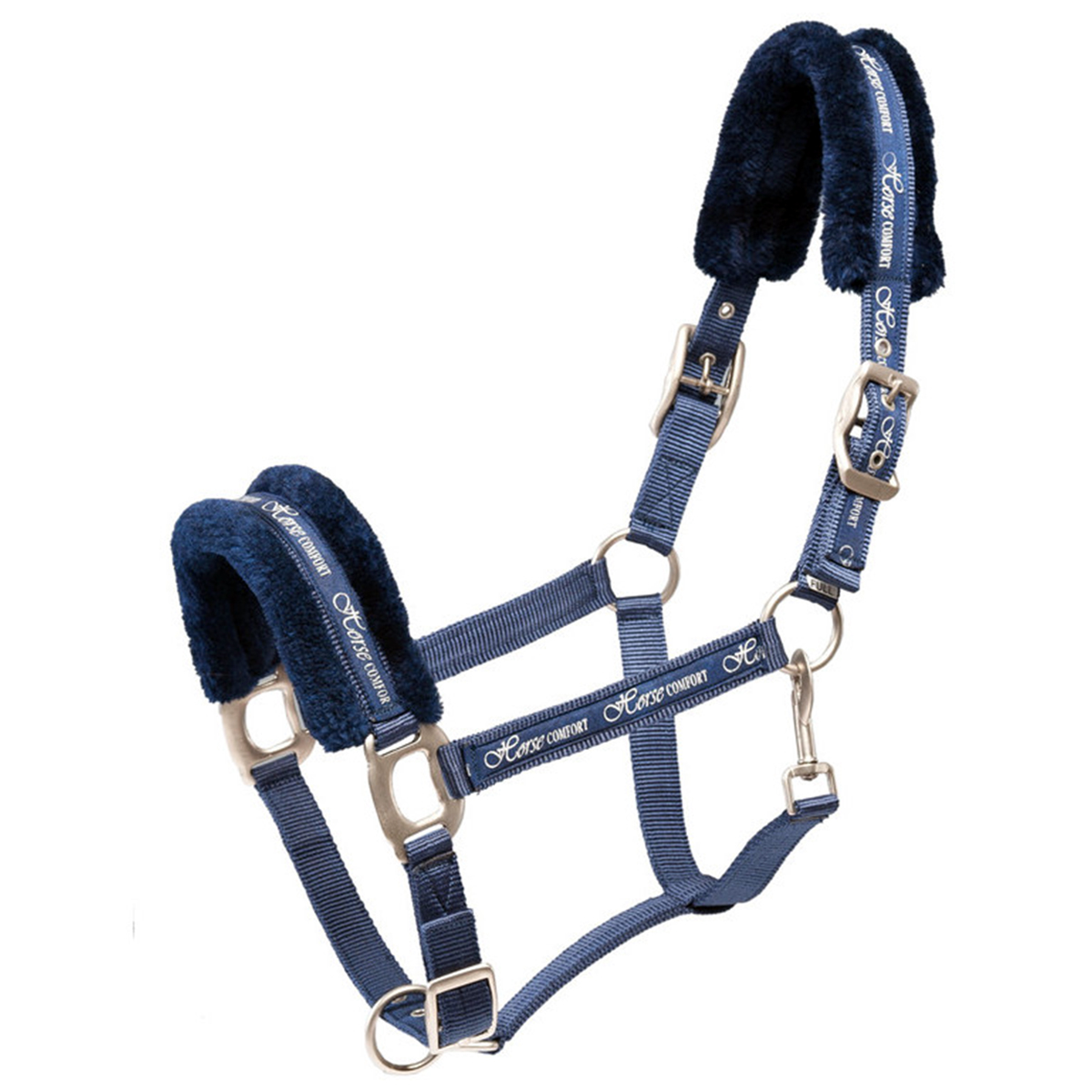 Удобный и красивый недоуздок с меховушками (Halter with plush padding). Меховые подложки на носовом и затылочном ремнях, а также нащечные ремни украшены лентой с надписью "Horse COMFORT".