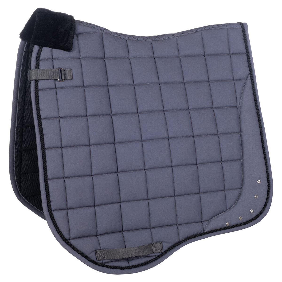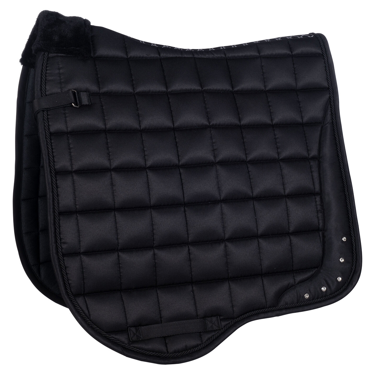 Универсальный вальтрап (All-Purpose Saddle Pad) анатомической формы с меховой вставкой, предотвращающей натирание холки. Вальтрап выполнен из красивой ткани, украшен декоративным шнуром и стразами. Дышащая сетчатая подкладка гарантирует превосходное поглощение влаги. Плотный наполнитель делает вальтрап объемным, что очень важно для амортизации. Вальтрап хорошо держит форму и легок в уходе. Крепится на липучки.