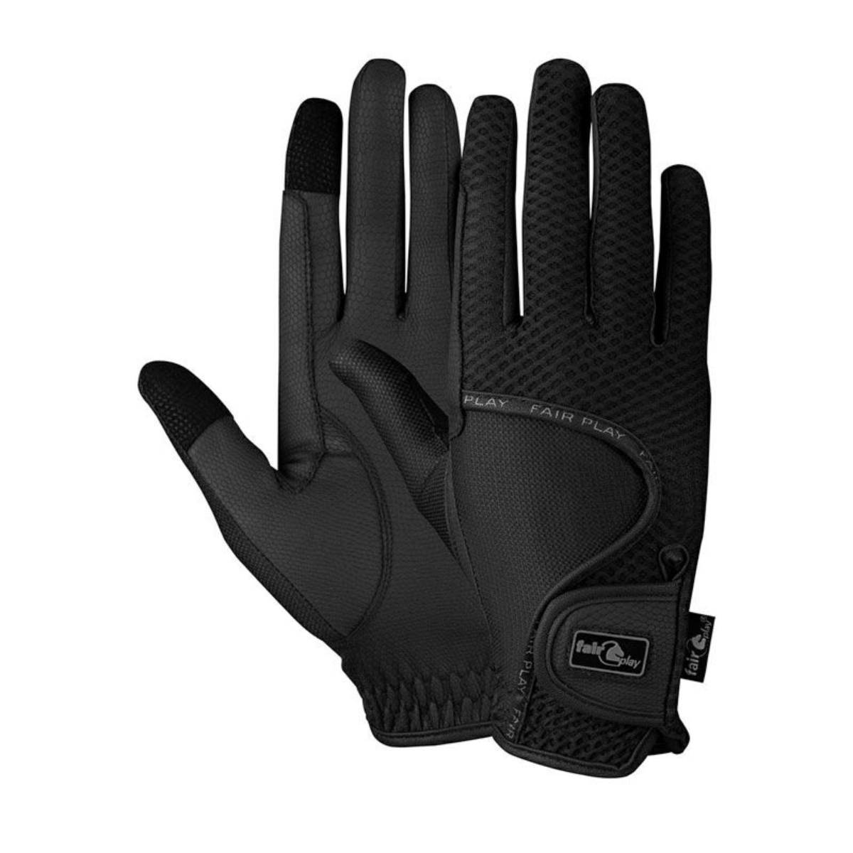 Перчатки из синтетической кожи с дышащим и нескользящим материалом. Наружная сторона ладони выполнена из тонкой дышащей сетчатой ткани, украшенной логотипом Fair Play. Липучка на манжете и усиленная защита в местах контакта с поводом обеспечивают дополнительную прочность и комфорт. Удобны для работы с сенсорным экраном.