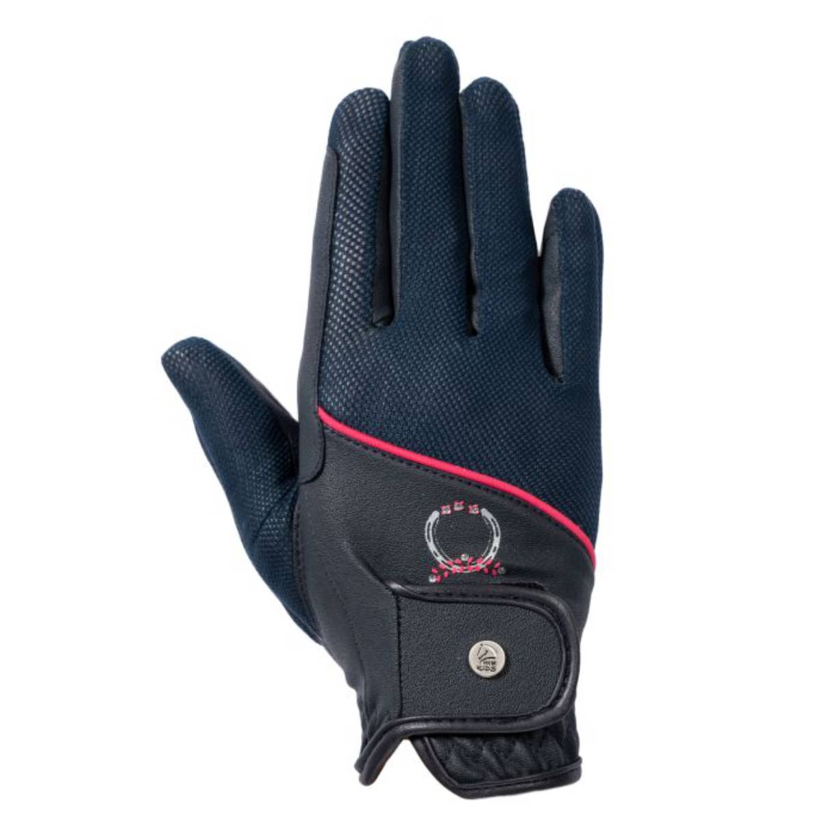 Перчатки детские HKM "Aymee" - идеальный вариант для теплой погоды. Верхняя сторона перчаток из эластичной ткани, что обеспечивает комфорт во время езды. Ладонь выполнена из полиуретановой кожи. С усилением на пальцах для лучшего сцепления с поводом. Резинка в области запястья. Застегиваются на липчку. Контрастная вставка. Украшены декоративной подковой и стразами.