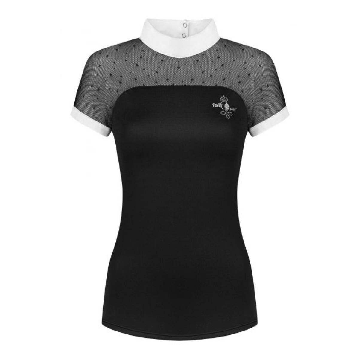 Очень красивая и элегантная женская турнирная блуза (Competition Shirt) с короткими рукавами. Грудь и спина из мягкого кружева. Приталенный силуэт. Короткий рукав и воротничок-стойка отделаны контрастной белой тканью. Выполнена из эластичной лёгкой дышащей ткани. Сзади застегивается на две кнопки. На груди блуза украшена стразами и логотипом Fair Play.