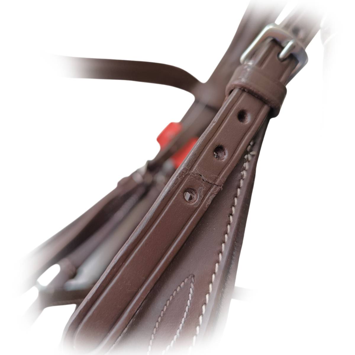 Уздечка из кожи высокого качества с мексиканским капсюлем (Cross Noseband Bridle). Затылочный ремень анатомической формы с мягкой подложкой. Подкладка налобного ремня и капсюля из мягкой кожи. Декоративная отстрочка. Нащечные ремни на крючках. Фурнитура из нержавеющей стали. Трензель и повод в комплект не входят.