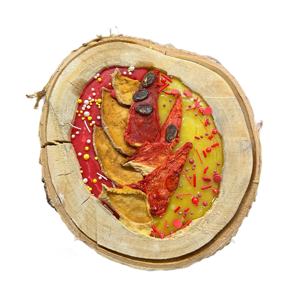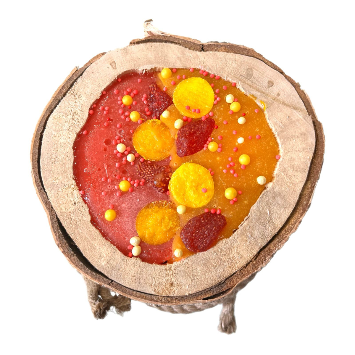 Состав: сахар, клубничный сироп (клубника,вода, стевия), сушеная клубника, сироп из манго ( манго, вода и стевия), сушеное манго, кукурузный крахмал, кондитерская посыпка.