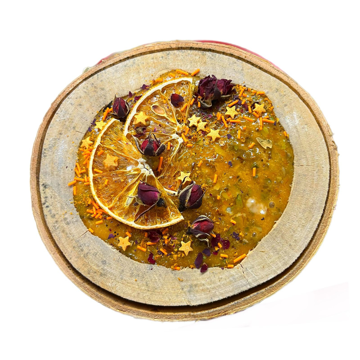 Состав: сахар, облепиховый сироп (облепиха, вода, стевия), сушеная молотая облепиха, сушеный лист малины, сушеный лист облепихи, сушеный лист смородины, апельсиновые чипсы, чайная роза, кукурузный крахмал, кондитерская посыпка.