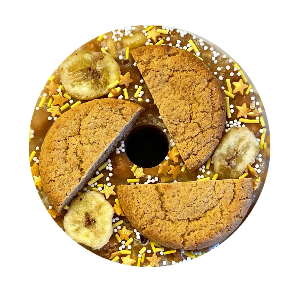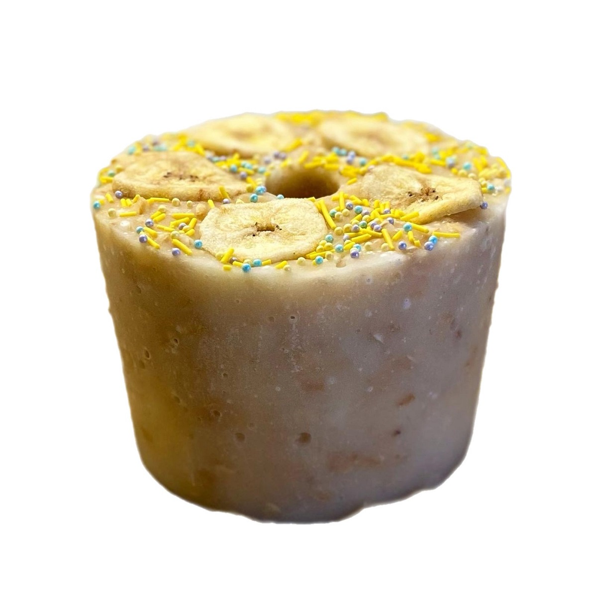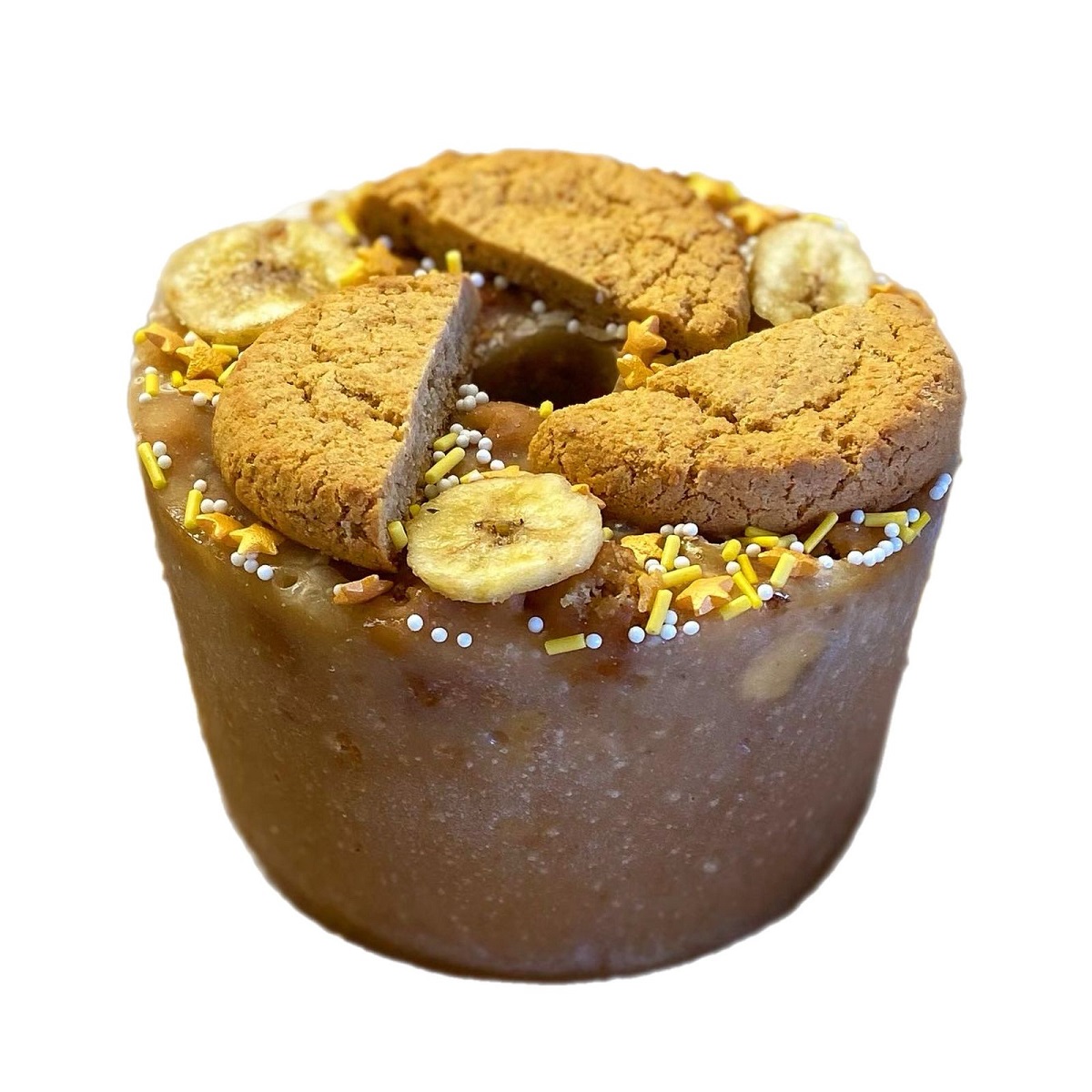 Состав: сахар, ванильный сироп, сушёный банан, овсяное печенье (мука пшеничная, мука овсяная, сахар, соль, инвертный сироп, патока, яблочное пюре, разрыхлитель, корица), кукурузный крахмал, сахарная посыпка (сахар, кукурузный крахмал, натуральные красители).