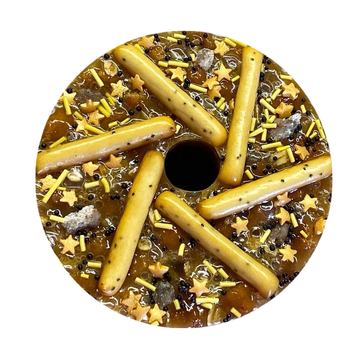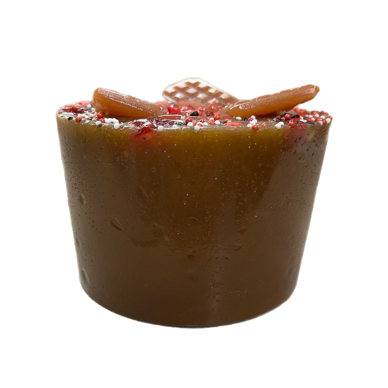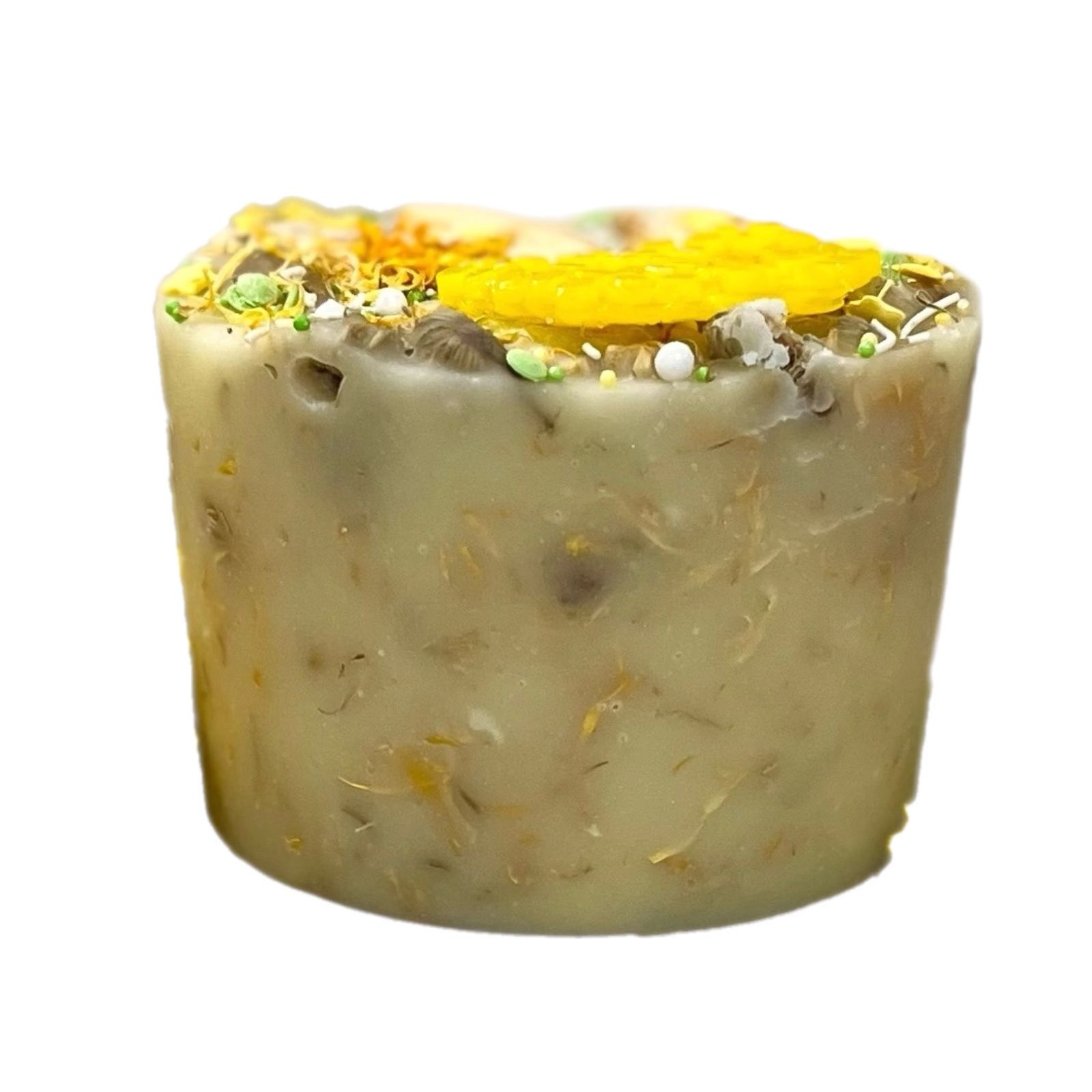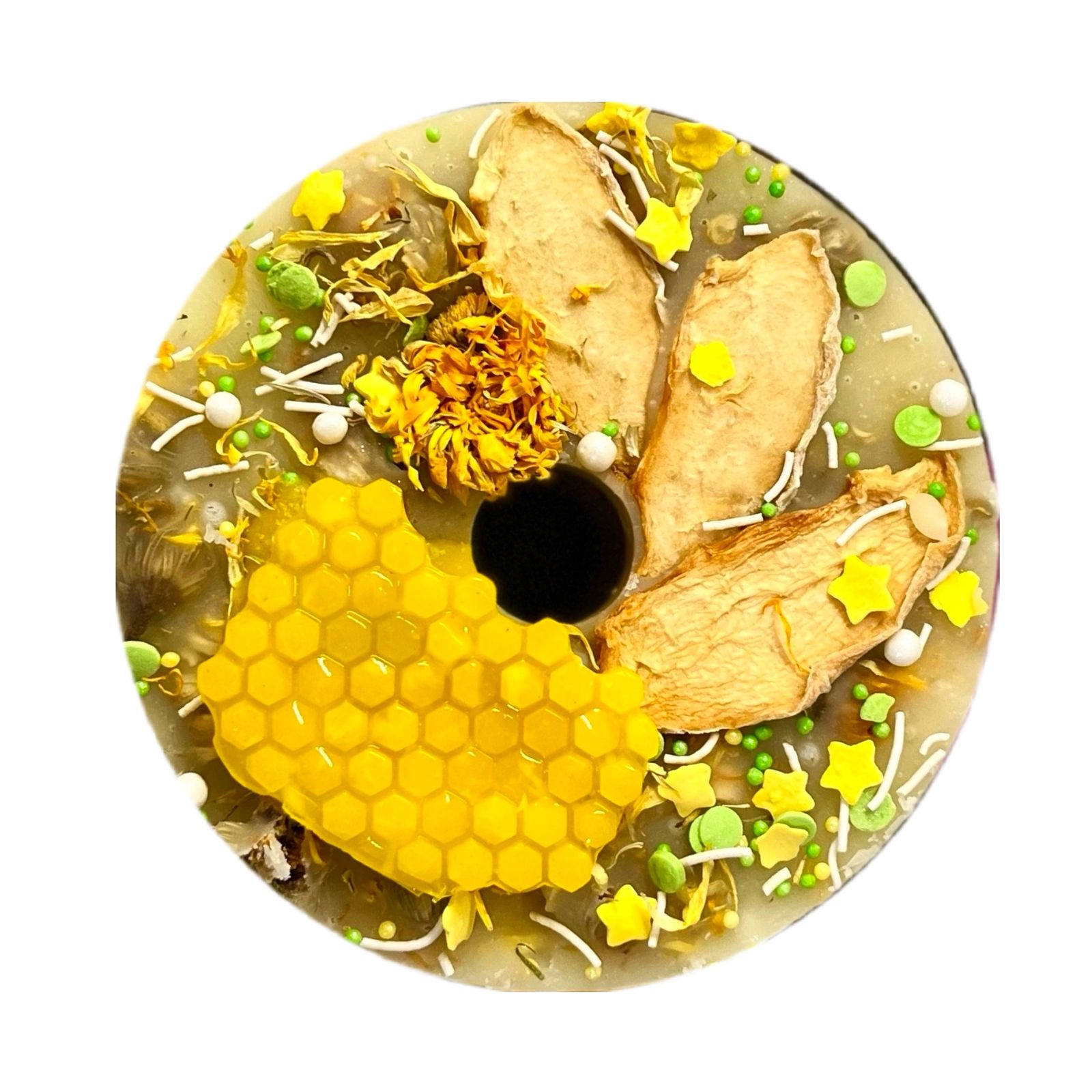 Состав: сахар, сироп из дыни (дыня, вода, стевия), мед, дыня сушеная, календула, кукурузный крахмал, сахарная посыпка (сахар, кукурузный крахмал, натуральный краситель).
