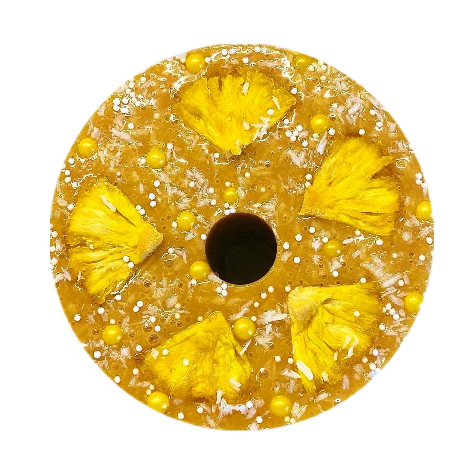 Состав: сахар, кокосовый сироп (кокос, вода, стевия), ананасовый сироп (ананас, вода, стевия), сушёный ананас, кокосовая стружка, кукурузный крахмал, сахарная посыпка (сахар, кукурузный крахмал, натуральные красители).