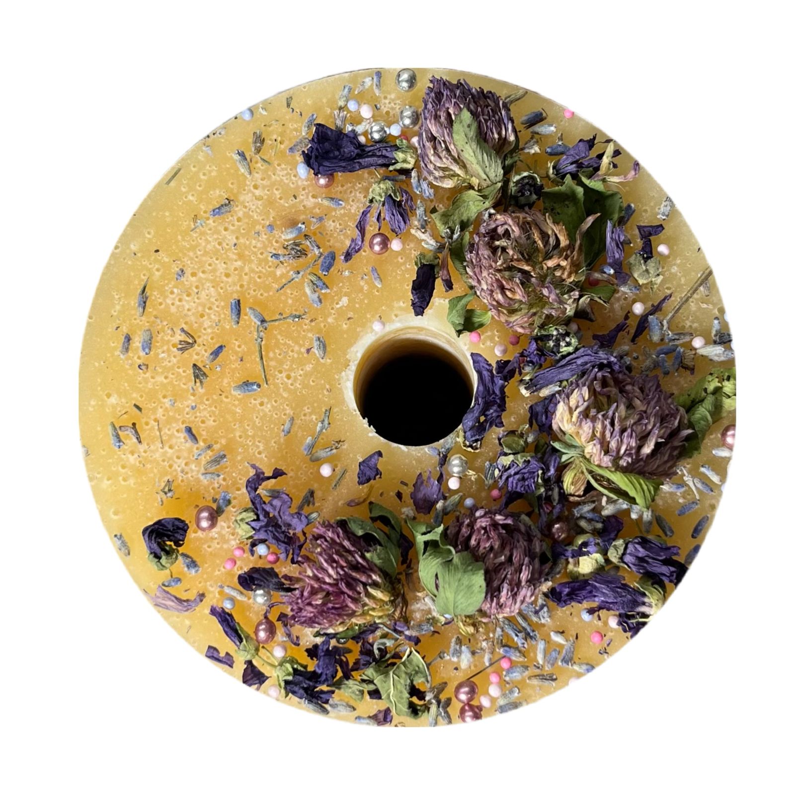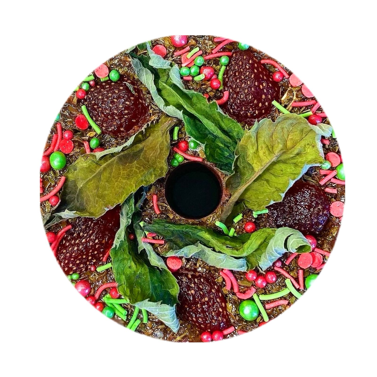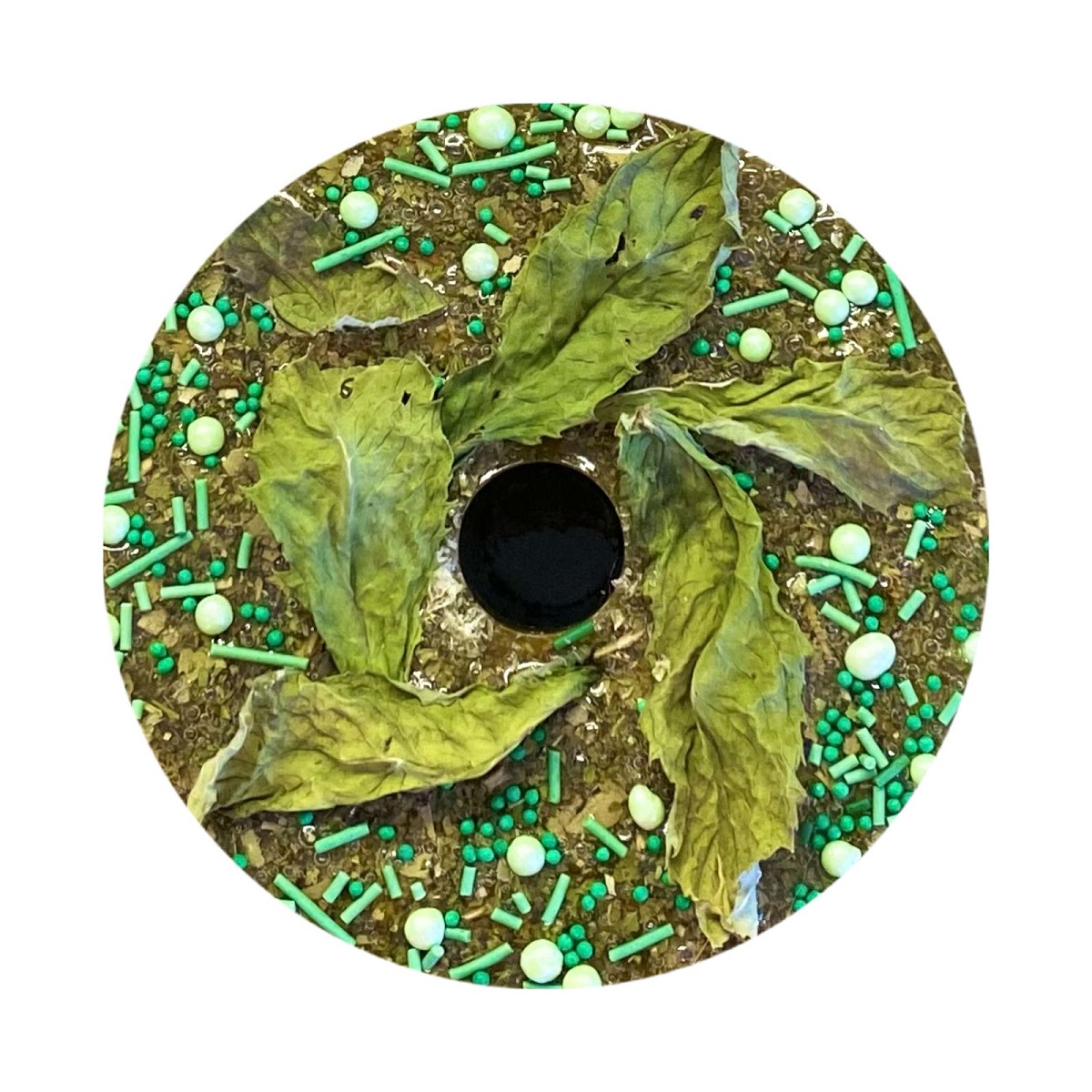 Большая круглая конфета с кондитерской посыпкой с содержанием трав в составе.