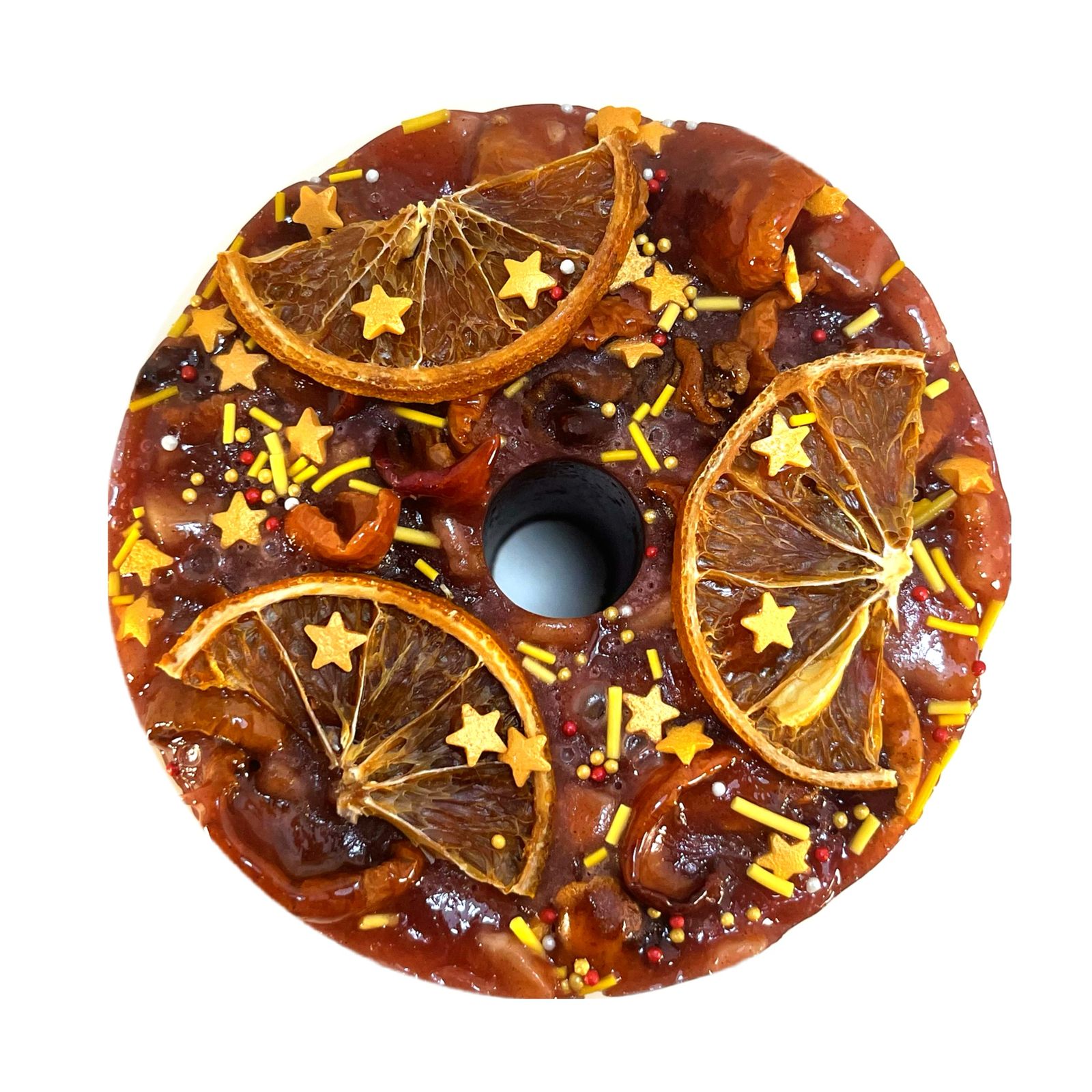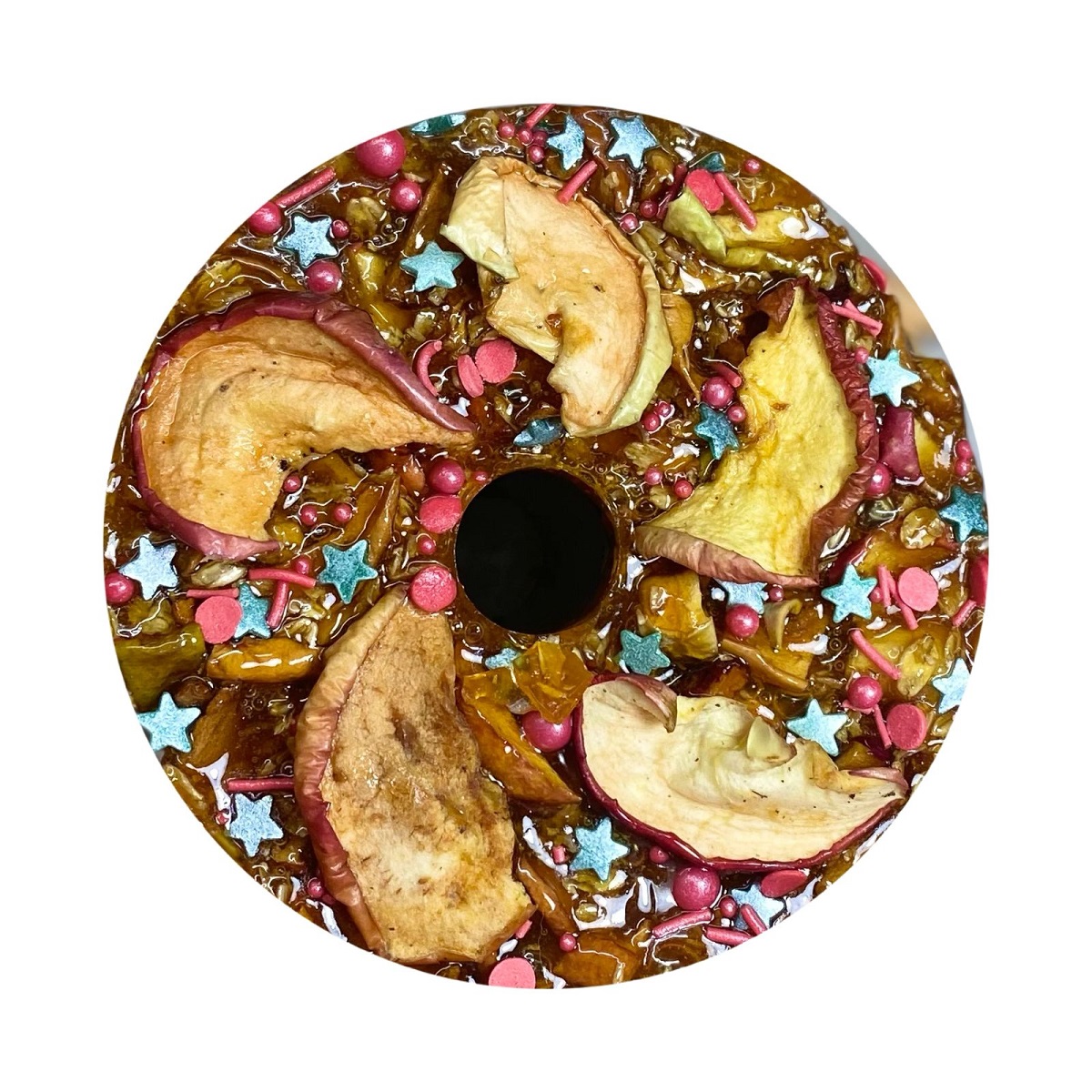 Соста: сахар, вишневый сироп (вишня, вода, стевия), сушёные яблоки, сушёные груши, апельсиновые чипсы, корица, кукурузный крахмал, сахарная посыпка ( сахар, кукурузный крахмал, натуральные красители).