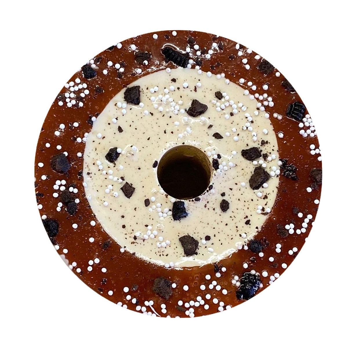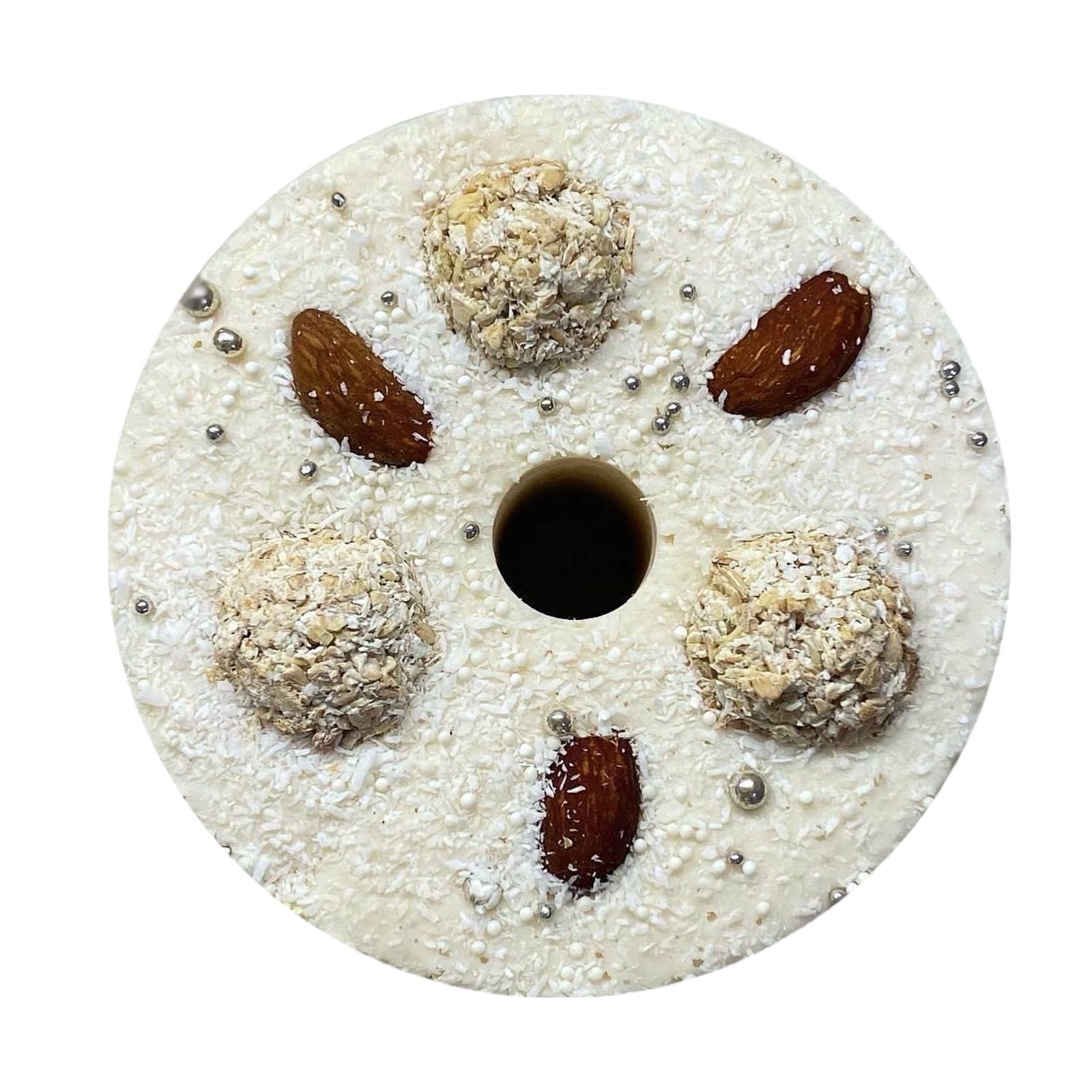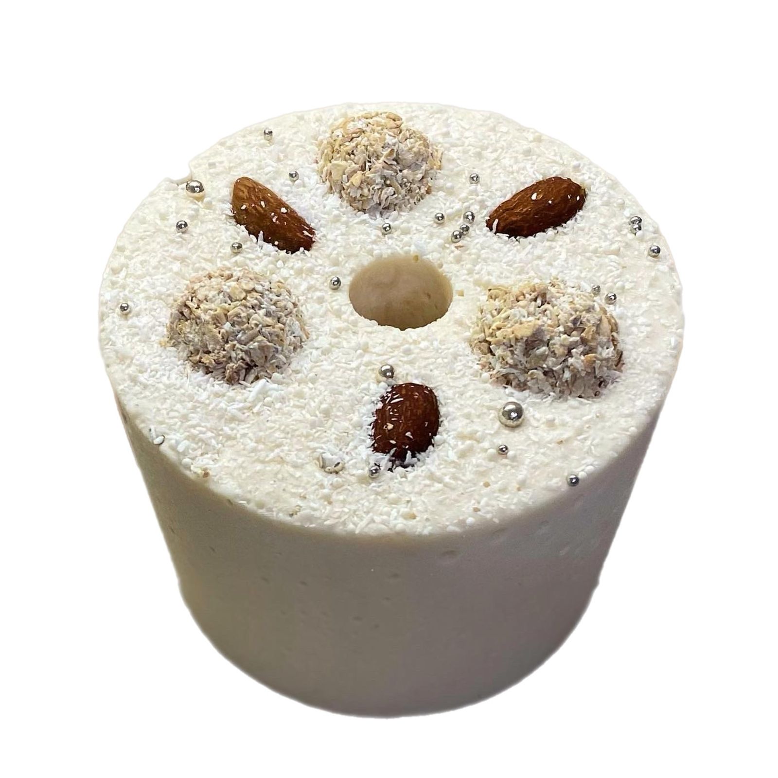 Идеальное сочетание вкуса белого шоколада с кокосовыми чипсами и кокосовой стружкой. Сверху украшения в виде рафаэллок из овсяных хлопьев, патоки и кокосовой стружки.