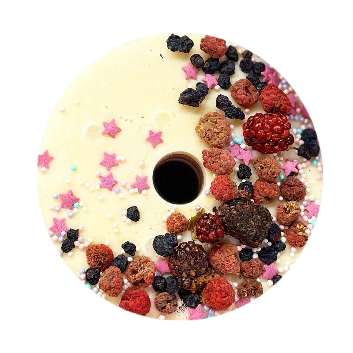 Состав: сахар, ежевичный сироп (ежевика, вода, стевия), ванильный сироп (ваниль, вода, стевия), сушёная ежевика, сушёная малина, сушёная черника, кукурузный крахмал, сахарная посыпка (сахар, кукурузный крахмал, натуральные красители).