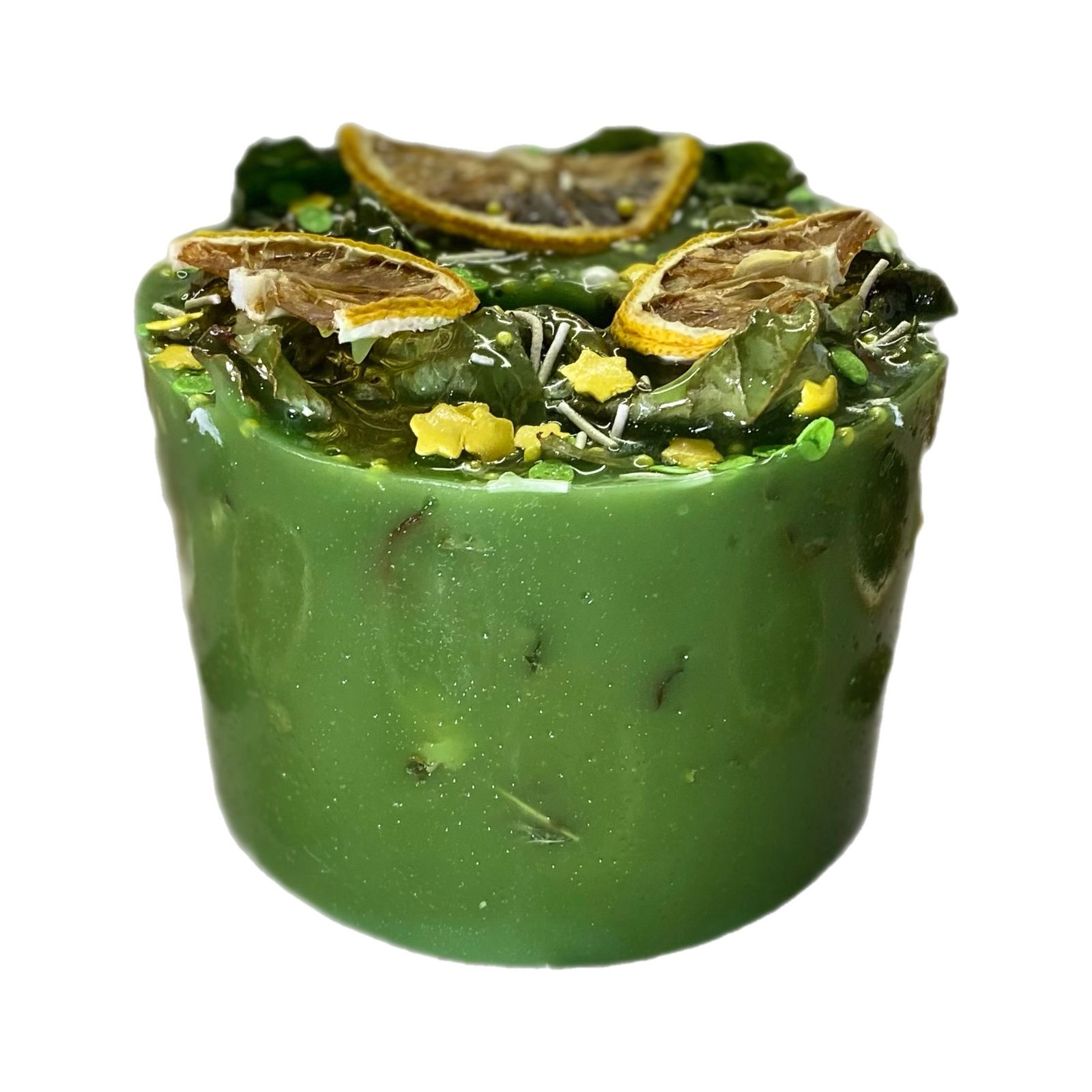Состав: сахар, сироп «мохито» (вода, концентрированный лимонный сок, ароматизаторы, лимонная кислота), мята перечная, лимонные чипсы, кукурузный крахмал, сахарная посыпка (сахар, кукурузный крахмал, натуральные красители).