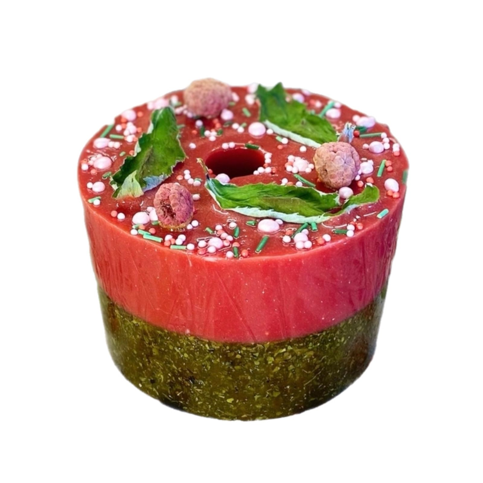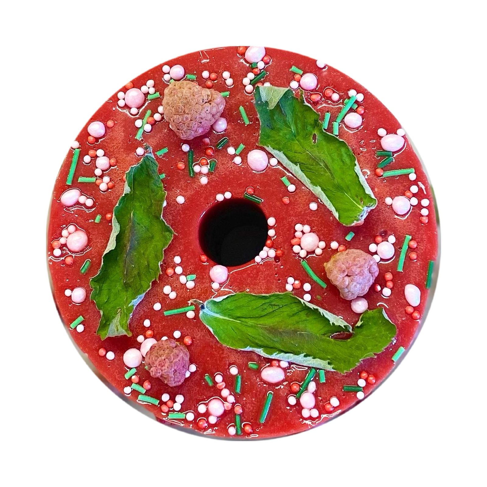 Состав: сахар, малиновый сироп (малина, вода, стевия), сушёная малина, мята перечная, кукурузный крахмал, кондитерская посыпка (сахар, кукурузный крахмал, натуральные красители).