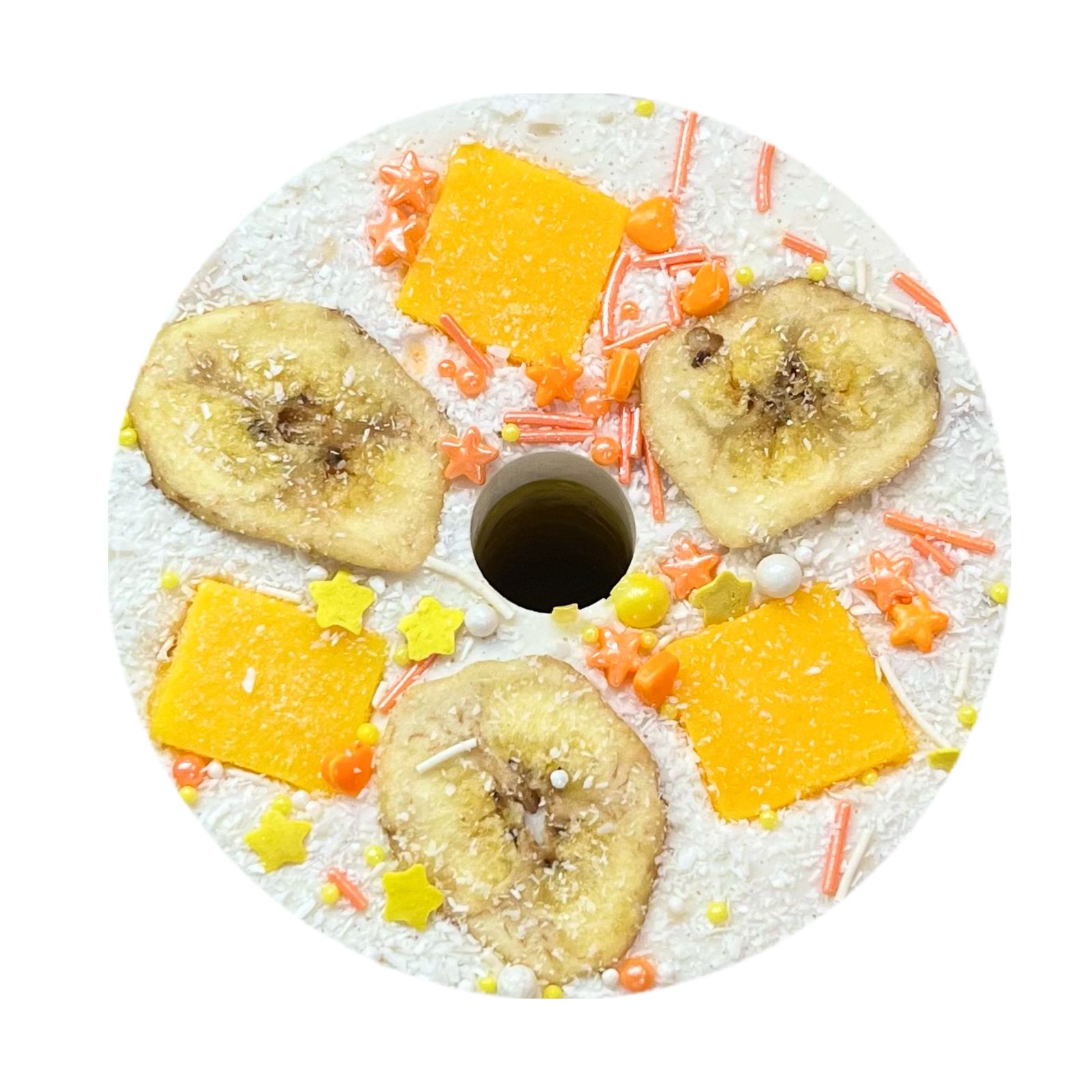 Состав: сахар, кокосовый сироп, ананасовый сироп, сироп из манго, кокосовая стружка, банановые чипсы, сушеный банан, натуральный мармелад из пюре манго (сахар, желатин, пюре манго), Кукурузный крахмал, сахарная посыпка (сахар, кукурузный крахмал, натуральные красители).