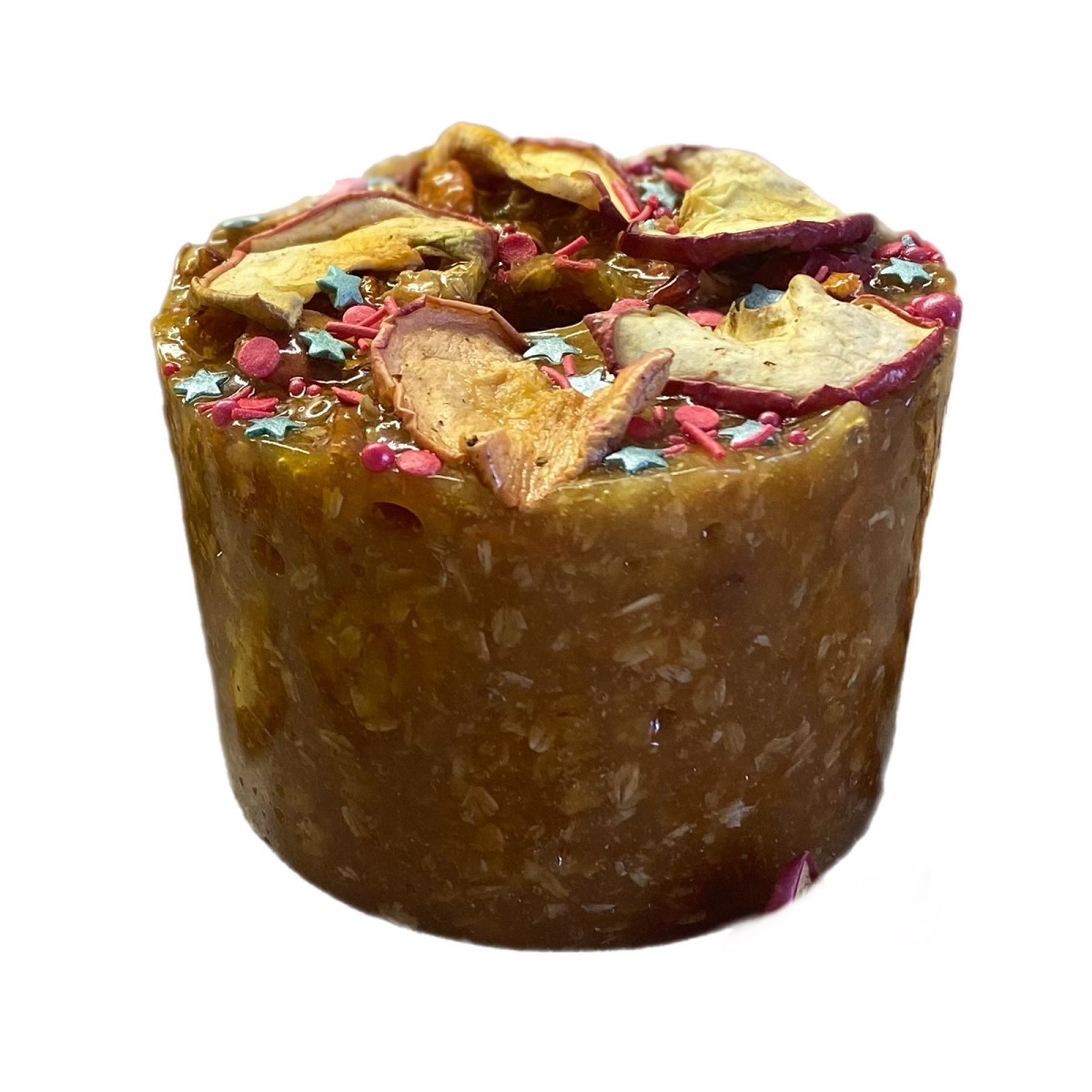 Состав: сахар, овсяные хлопья, сушёные яблоки, кукурузный крахмал, вода, сахарная посыпка (сахар, растительное масло, кукурузный крахмал, натуральные красители).