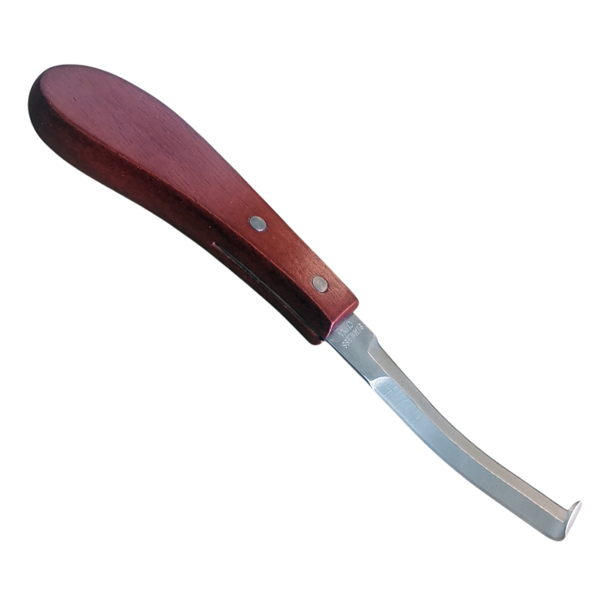Этот копытный нож с двухсторонним загнутым лезвием и удобной деревянной рукояткой - незаменимый инструмент для ковалей, ветеринаров и владельцев лошадей.
