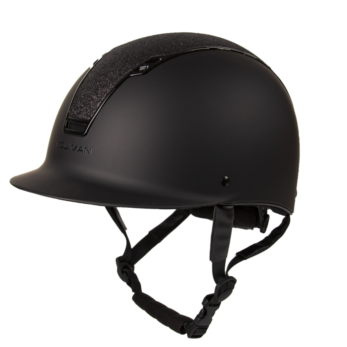 Шлем украшен блестящей вставкой черного цвета. По центру шлема надпись EQUIMAN.