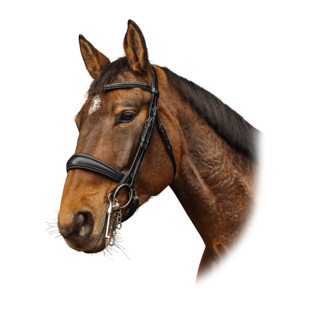 Завершает образ анатомический налобник с лаконичным дизайном - изящный и элегантный, подчеркивающий естественную красоту лошади.