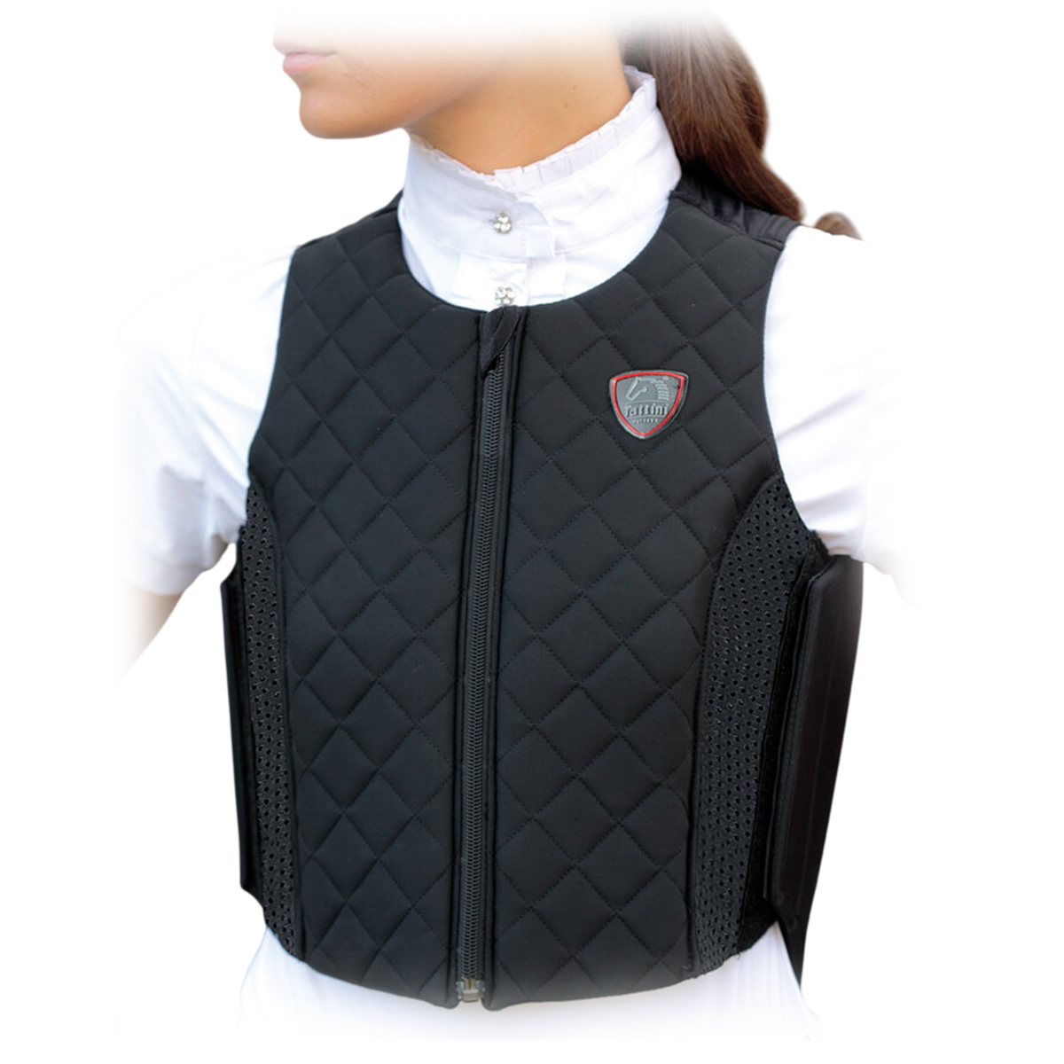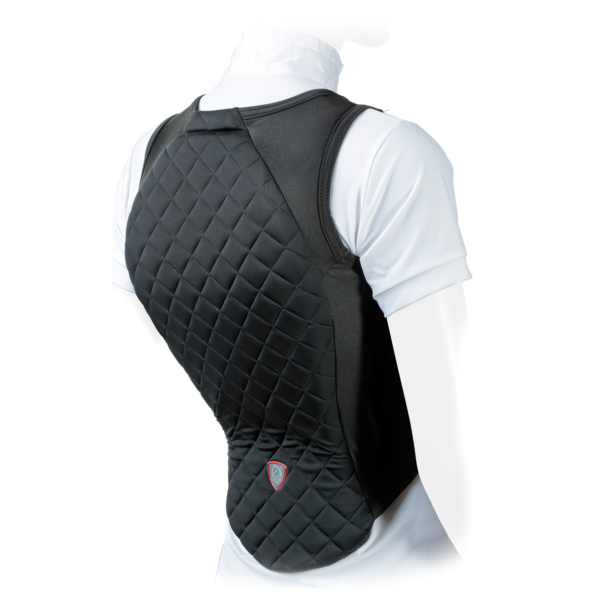 Задняя часть не должна касаться седла, а передняя должна быть ниже ребер минимум на 25 мм. Верх жилета должен достигать основания шеи. Правильная подгонка гарантирует максимальную защиту и комфорт в процессе верховой езды.
