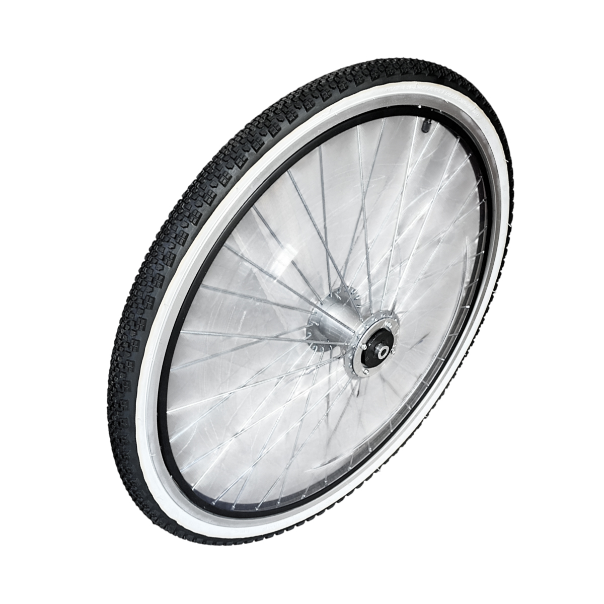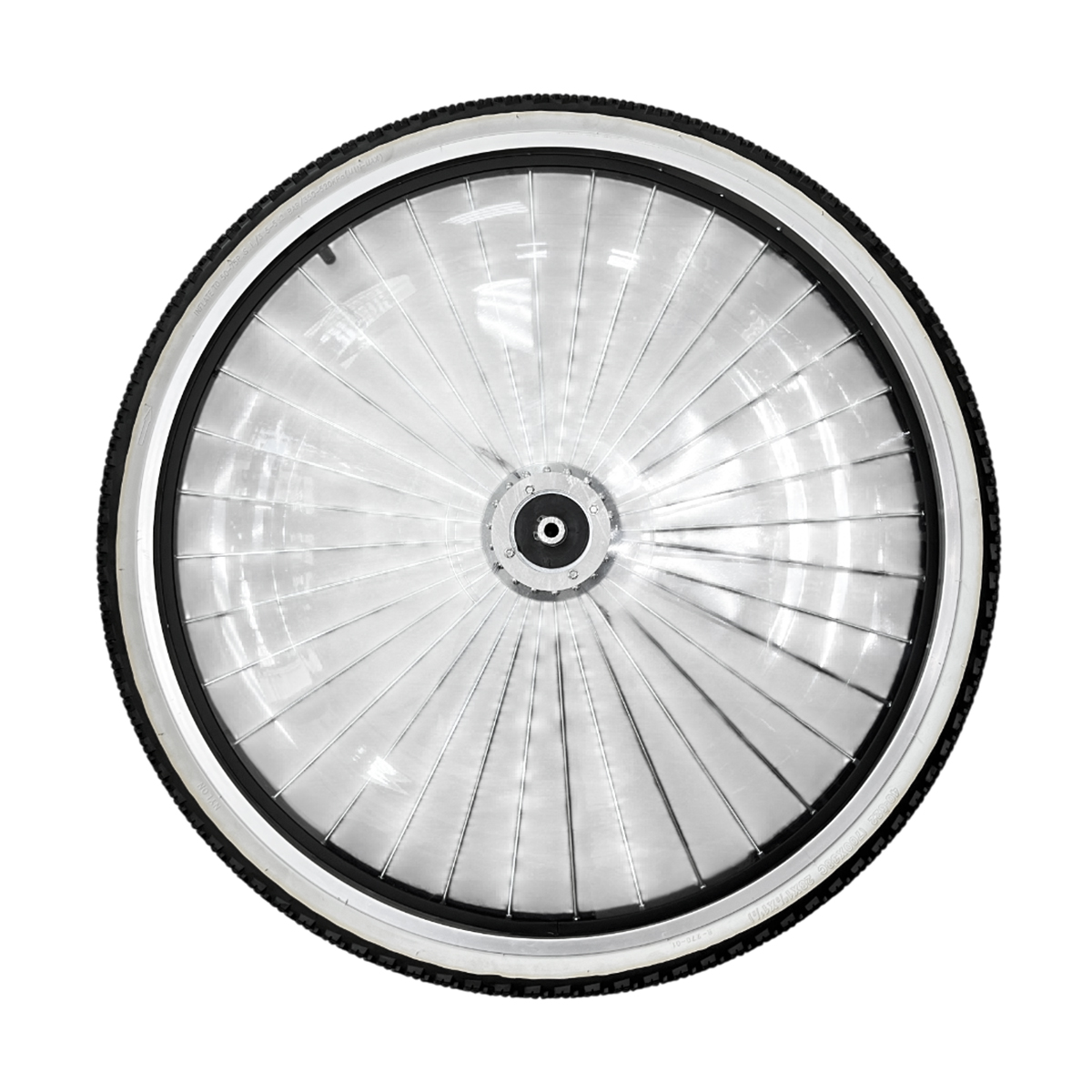 Колесо для призовой качалки с пластиковыми съемными колпаками. Прочные оцинкованные спицы толщиной 3 мм. Легкий и прочный обод. Алюминиевая усиленная ступица. Защищенные подшипники.